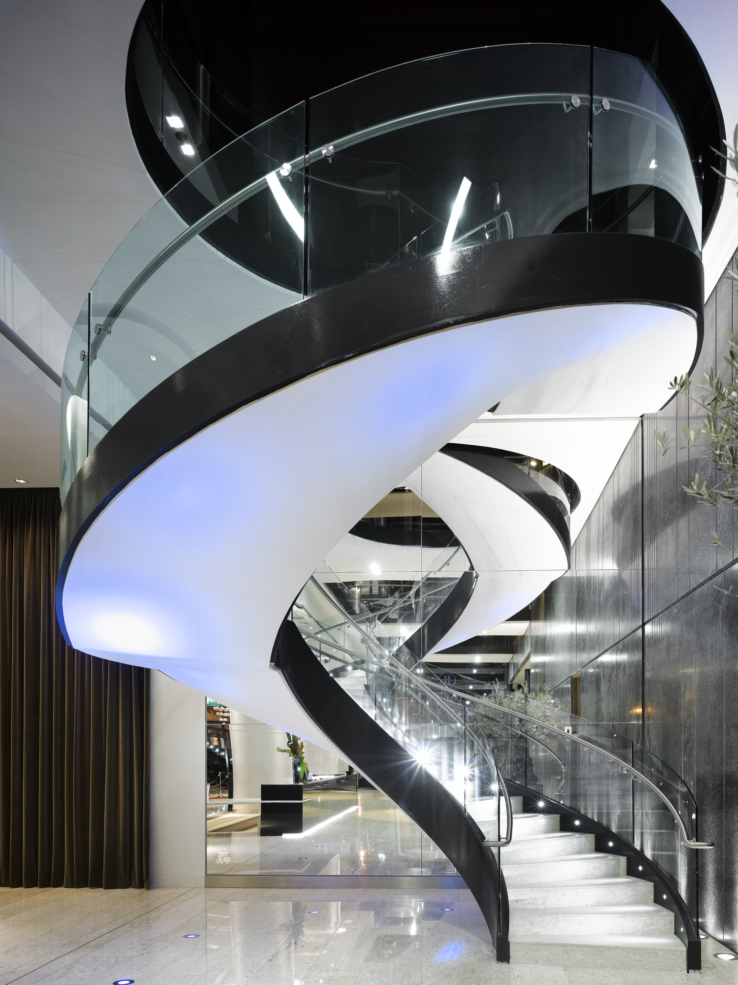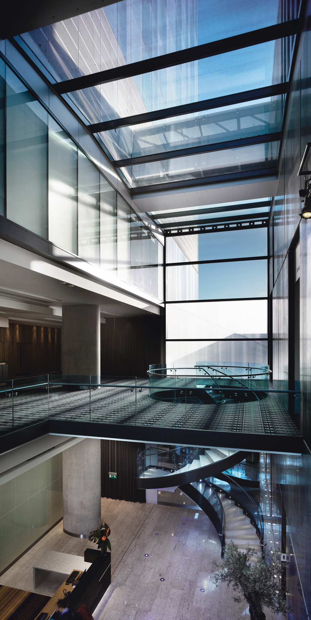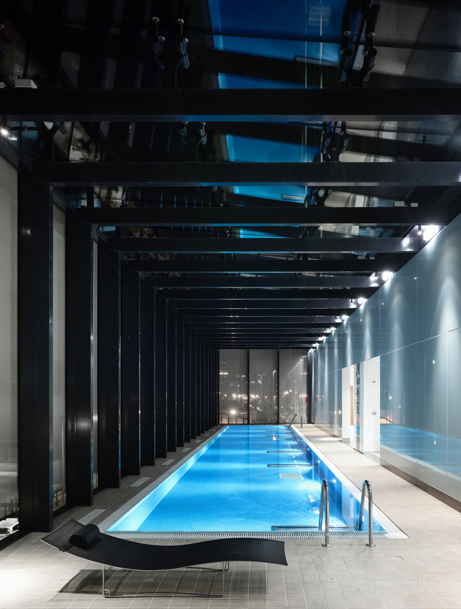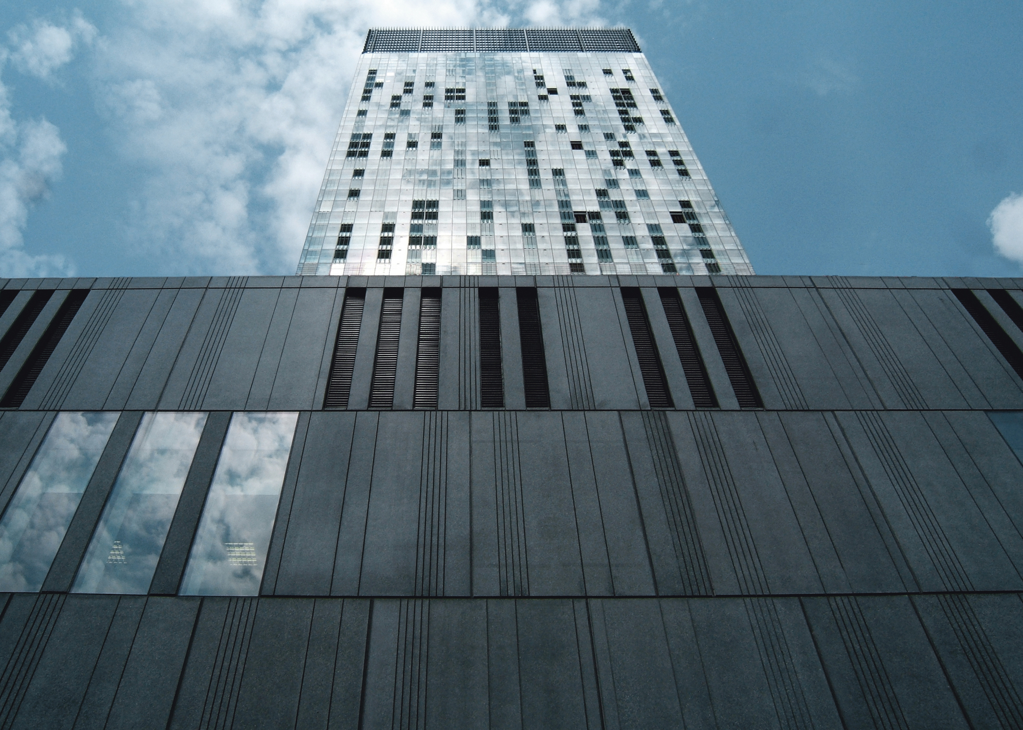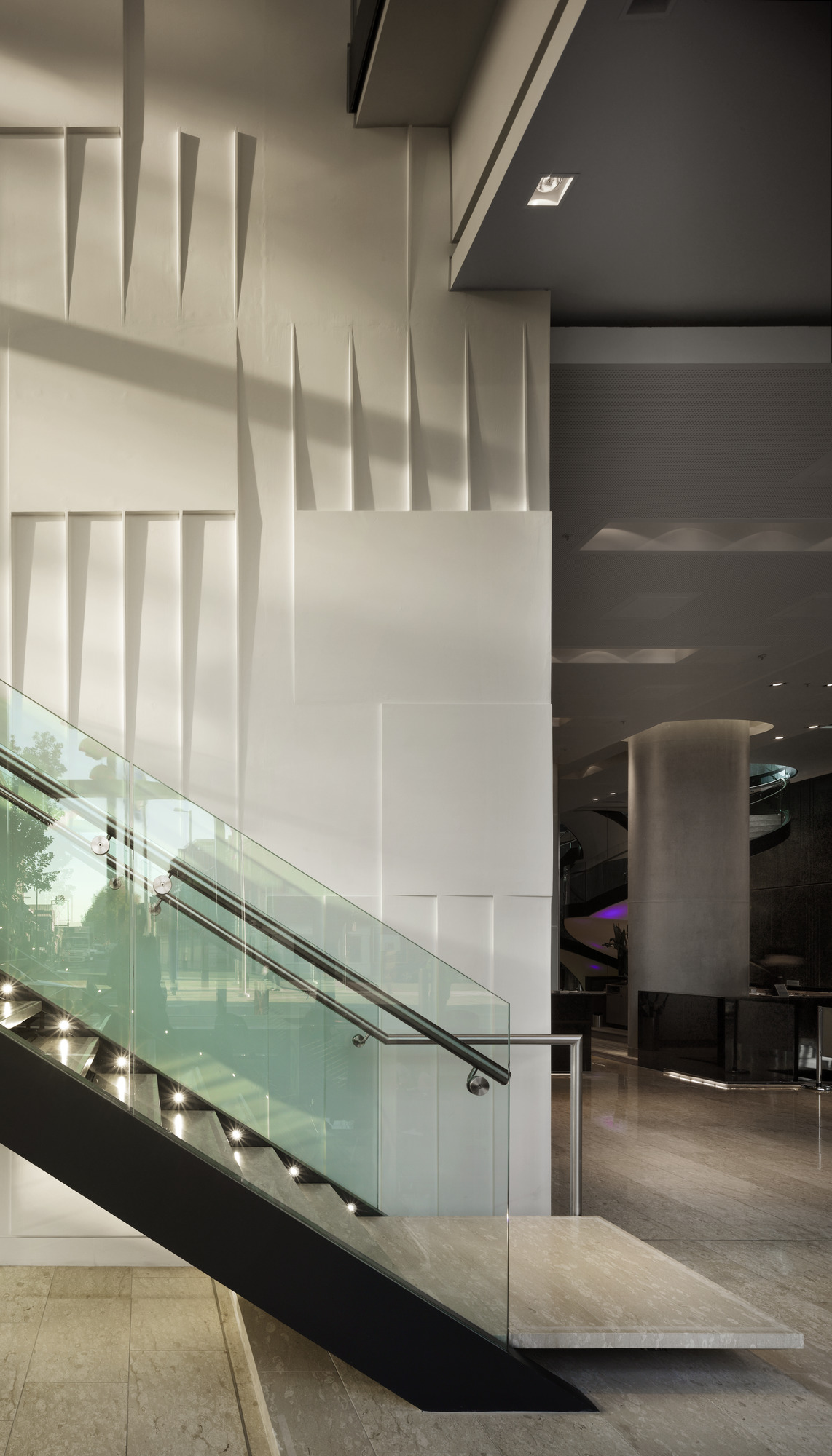 The envelope comprises a glazed skin that hints at the different aspects of the façade without disrupting the simplicity of the building form. The composition of transparent and solid elements emphasises the tower’s verticality and defines a grand scale that transcends that of an individual apartment or guest bedroom. A further level of refinement is provided by contrasting reflections and shadows from vertical opening louvres, perforated metal panels and solar shading fins.