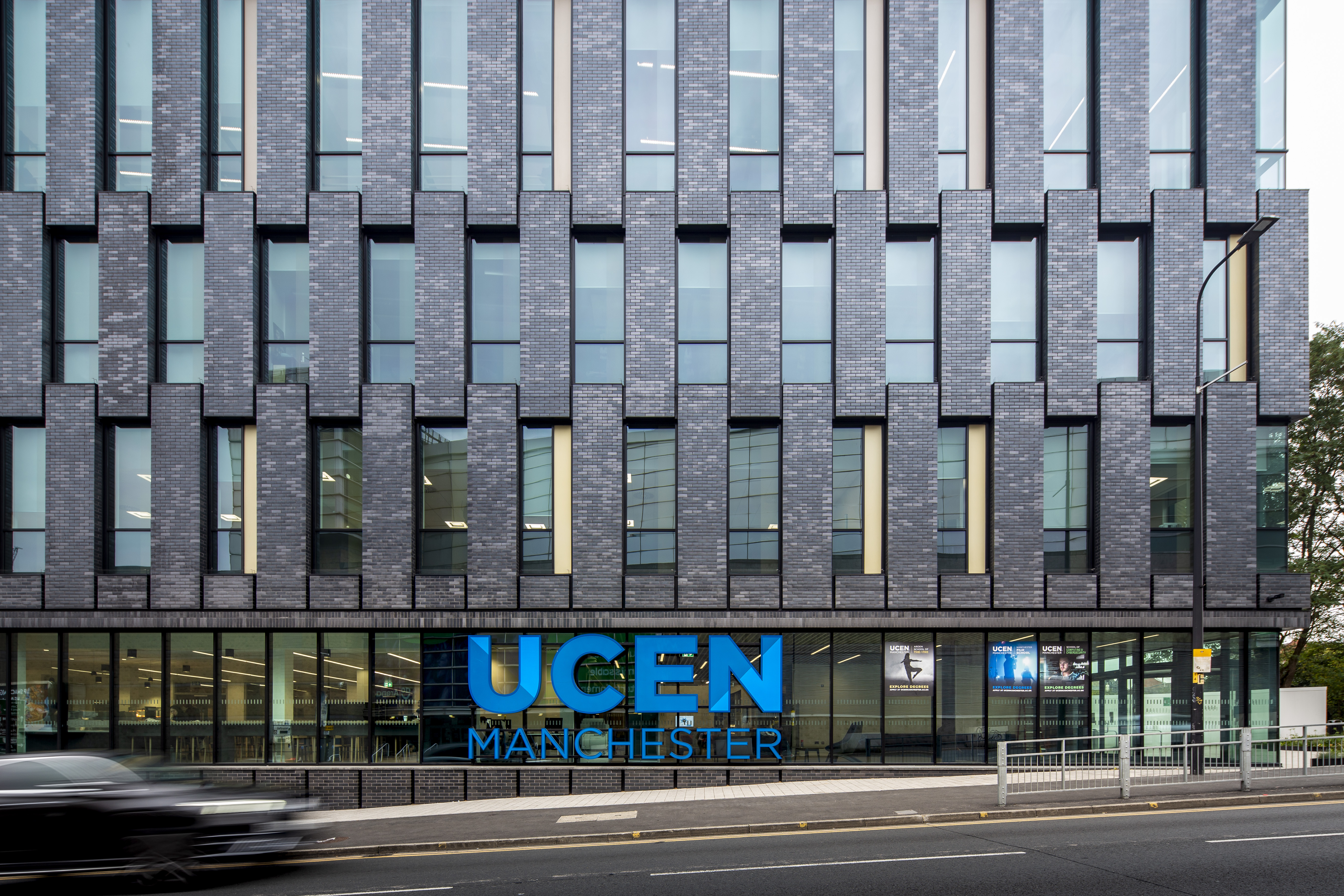 Replacing a surface car park on a prominent corner site in Manchester City Centre, the 18,500 sq. m campus comprises a range of teaching spaces including: two theatres, rehearsal spaces, dedicated music practice rooms, live rooms and recording studios, arts studios, shared workshop spaces, film and rehearsal studios, computing workshops, graphic design suites, and games design and computing rooms.
