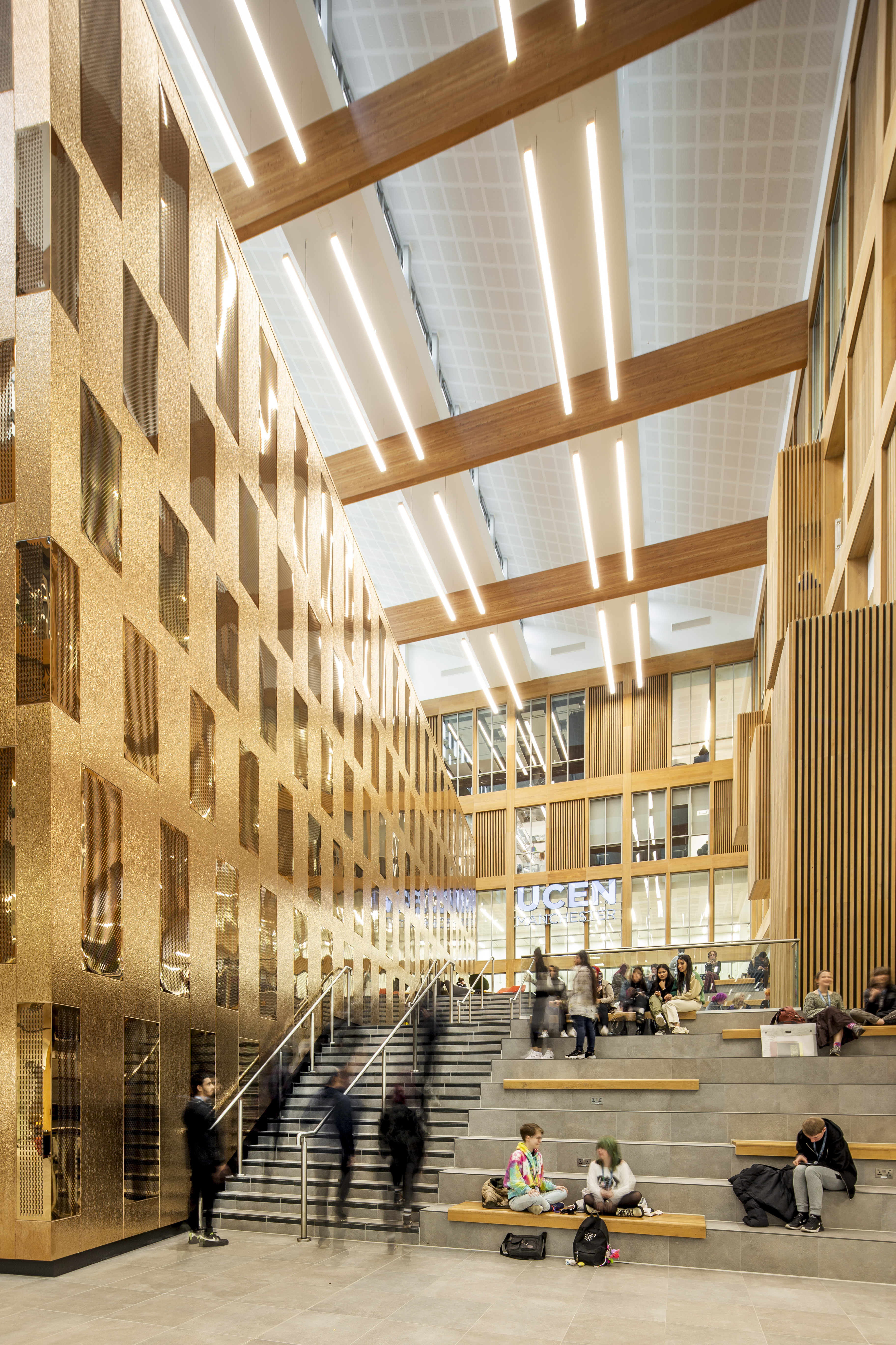 To create distinct identities for the two separate functions – the further education college (The Manchester College) and the university level provision (UCEN) – each has a dedicated entrance. The topography allows these to be at different levels, ground and first, connected by a wide, inhabitable staircase within the courtyard. While specialist facilities can be shared, each function has its own social areas, external roof terraces, libraries and learning resource centres. UCEN facilities are generally arranged on the eastern and southern (New Bridge St) wings, and Manchester College facilities on the northern and west (Ducie Street) wings.