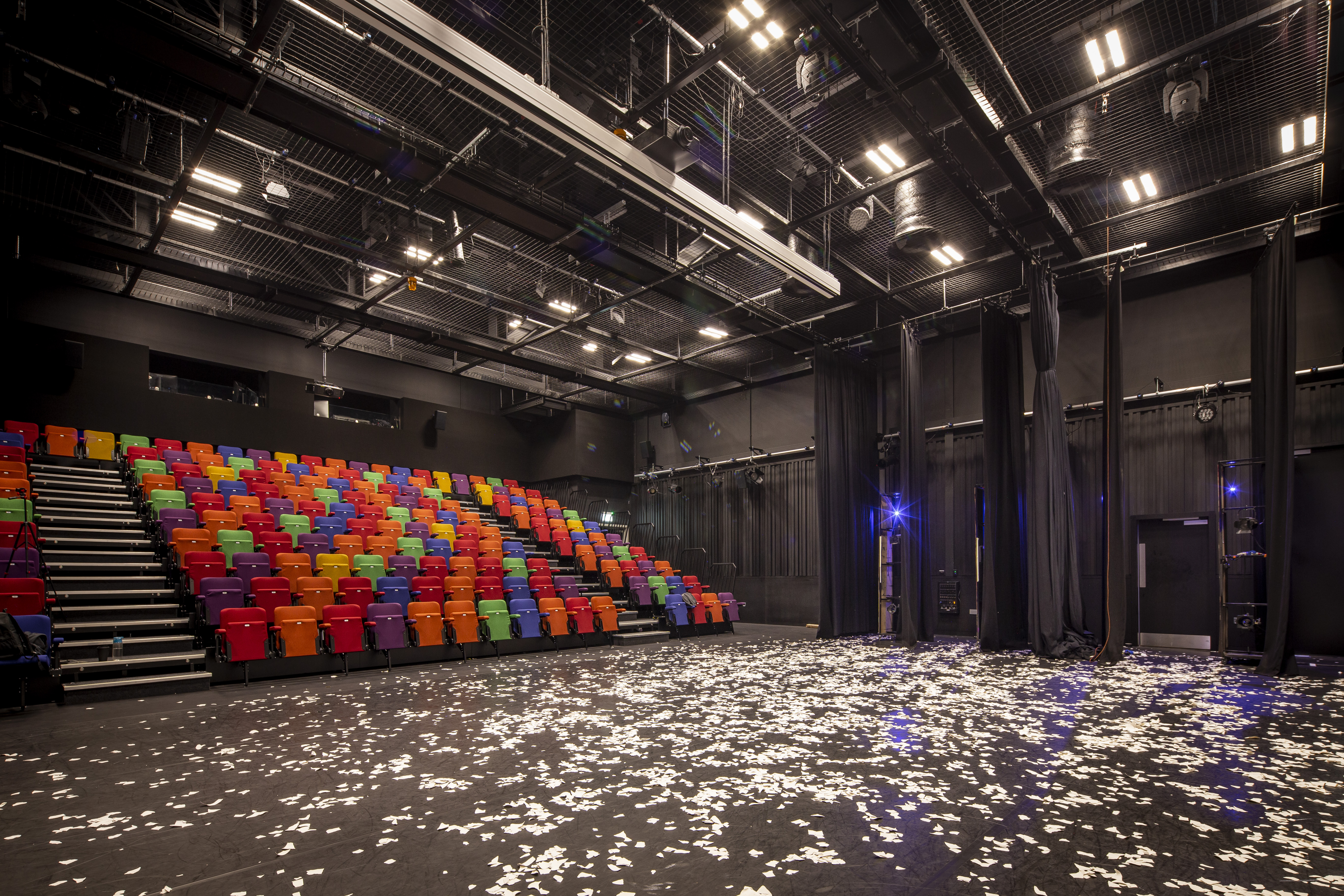 The main theatre, located at the centre of the courtyard, is designed as a “jewel box”, clad with embossed and perforated coloured stainless steel panels. Its distinctive form is visible through double height entrances from the surrounding streets, advertising the College’s exciting and varied curriculum to students and presenting a distinctive venue for public events and theatre nights.