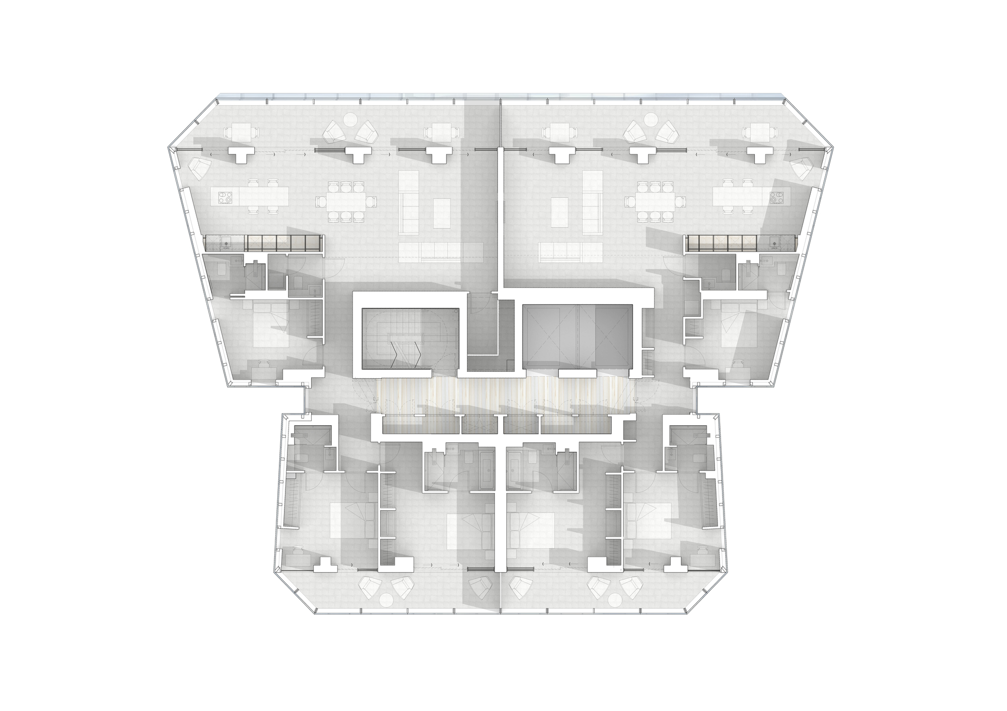 A simple rigour infuses every line of the tower's taut geometry. The building rises as two elegant crystalline forms fused together by the joint of the circulation core. The west façade facing the waterfront appears to ripple, its meticulously detailed folds and creases evoking a waterfall gathering pace as water descends. By resting lightly on the ground, additional space for the landscaped waterside public realm is created.