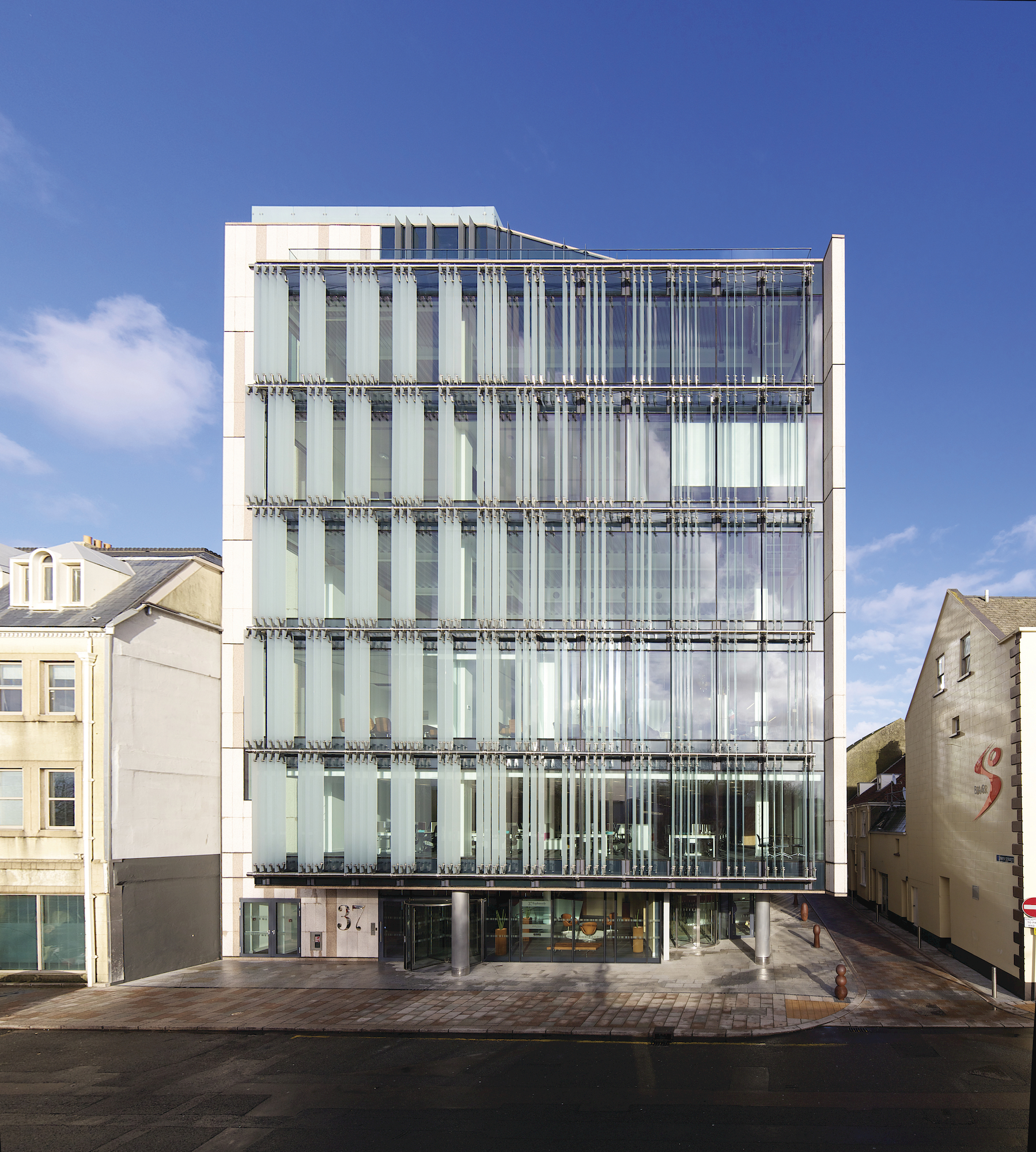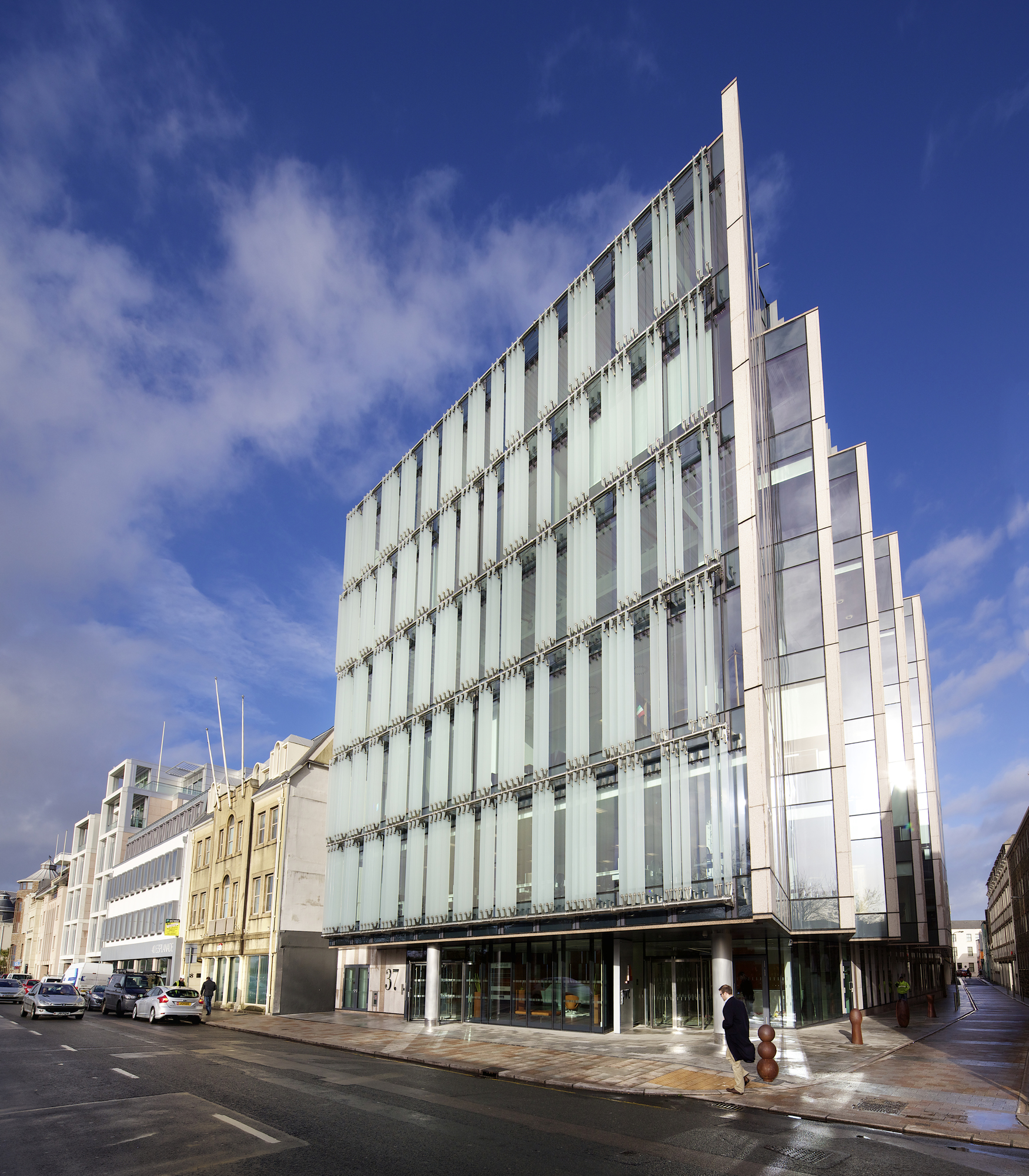 Jersey has limited natural resources and few indigenous industries, therefore the design responds to the opportunities and constraints of importing prefabricated building elements by sea. In particular, the size and weight of composite and unitised façade panels takes account of special local conditions for manufacture, shipping and construction.