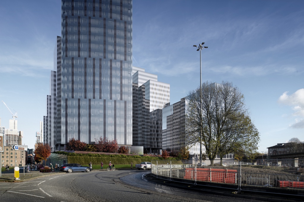 Three of the four buildings are arranged in a linear formation edging the North, East and South sides of the site. The fourth building is free in form and sits as more of an object in the landscape reaching up to 45 storeys. This helps to define and reinforce the street scape and the reinstatement of Newcastle Street provides a direct link from First Street to Hulme and the universities beyond the Mancunian Way.