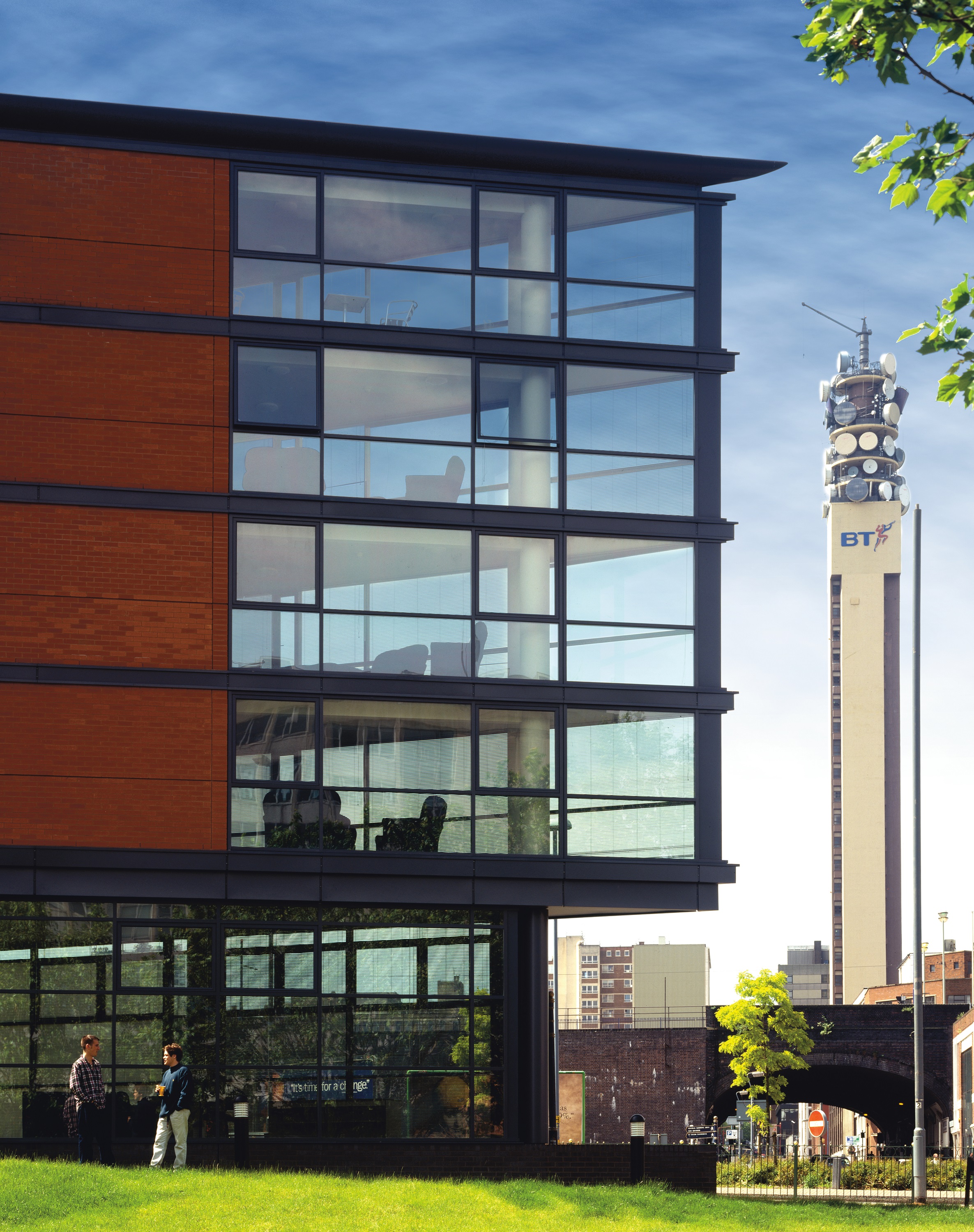 The facades adopt a limited palette of materials in a simple composition of solid and transparent which derives from the internal organisation and expresses the structural frame. Crisply defined panels of stack-bonded brick echo the colour and warmth of local buildings without suggesting that they are of load-bearing construction. A restaurant and meeting rooms provide active frontages at ground floor while visual permeability at high level is maintained by a glazed 'prow'.