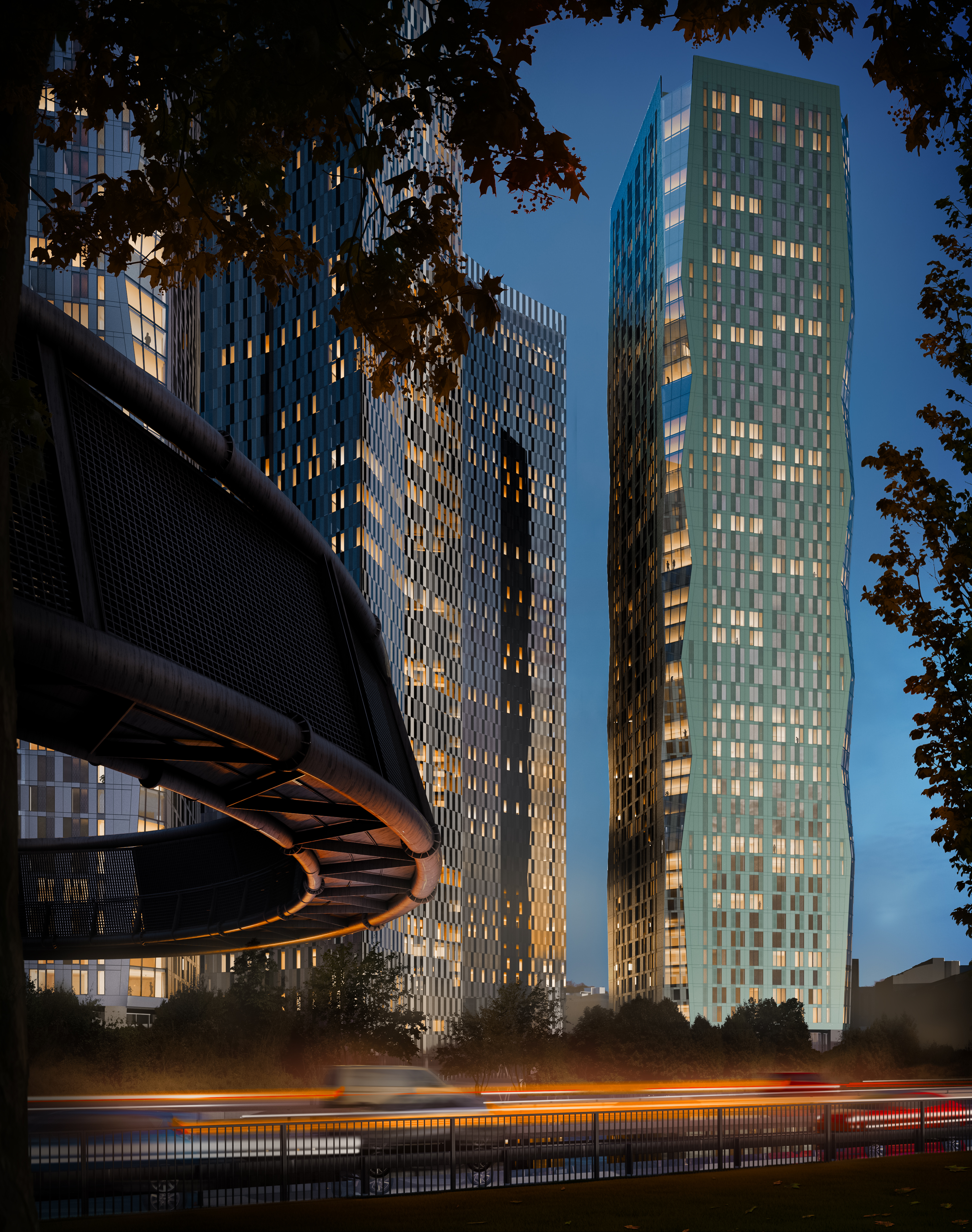 The form of each tower is identical, based upon a square plan with chamfered corners. The chamfered corners incrementally decrease and then increase over 5 storeys creating a dynamic vertical movement up the building.