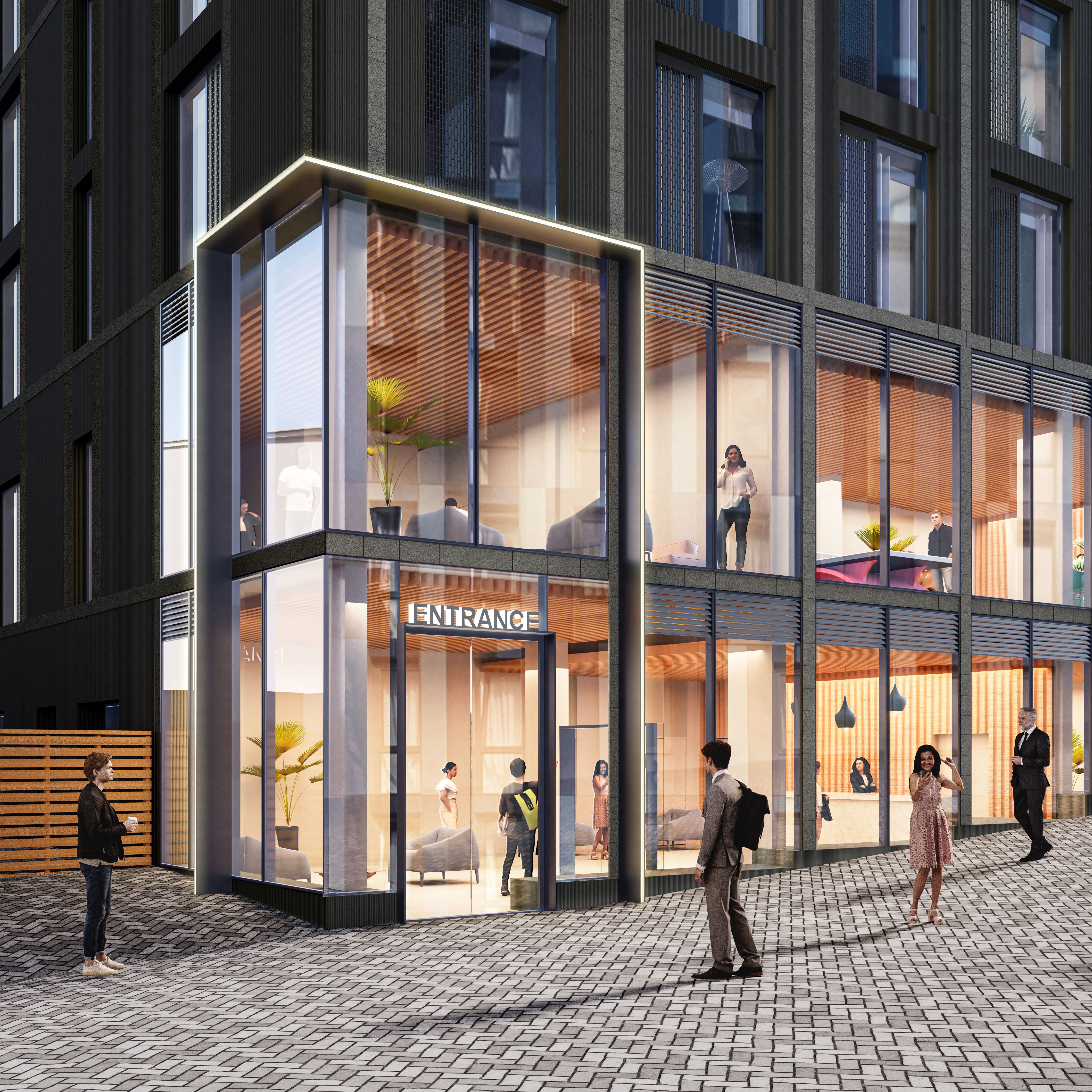 Revitalising a derelict site, the single building is visually broken into three distinct volumes, reaching 9, 11 and 13 storeys above ground. These stepping blocks are emphasised through the choice of materiality, tone and texture. A unifying planar grid is conveyed using contrasting terracotta textures in which a smooth grid is distinct against the visually recessed texture tile profile. The elevations showcase a blend of a terracotta rainscreen façade system, dark grey and bronze anodised aluminium vent panels and sleek PPC framed window units.
