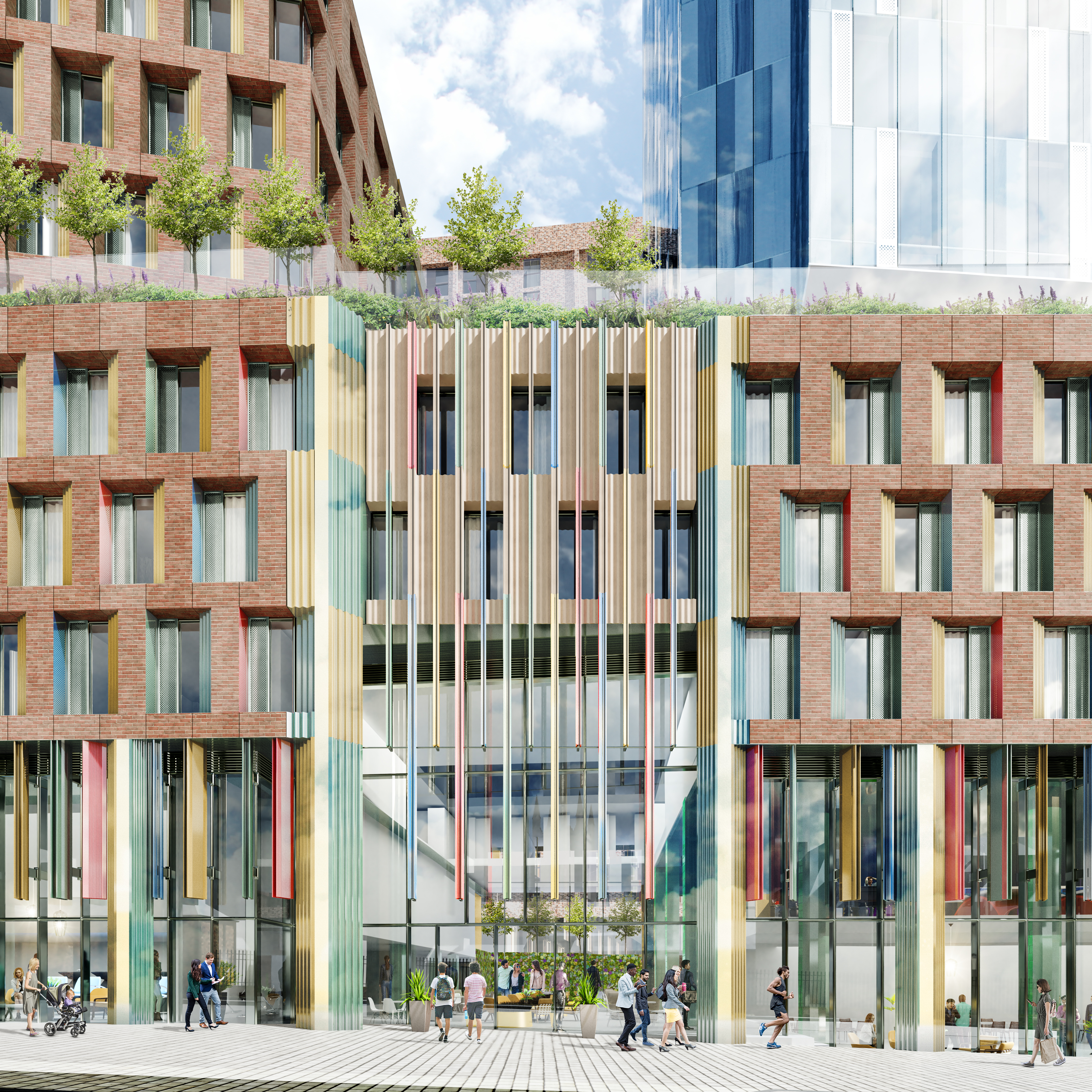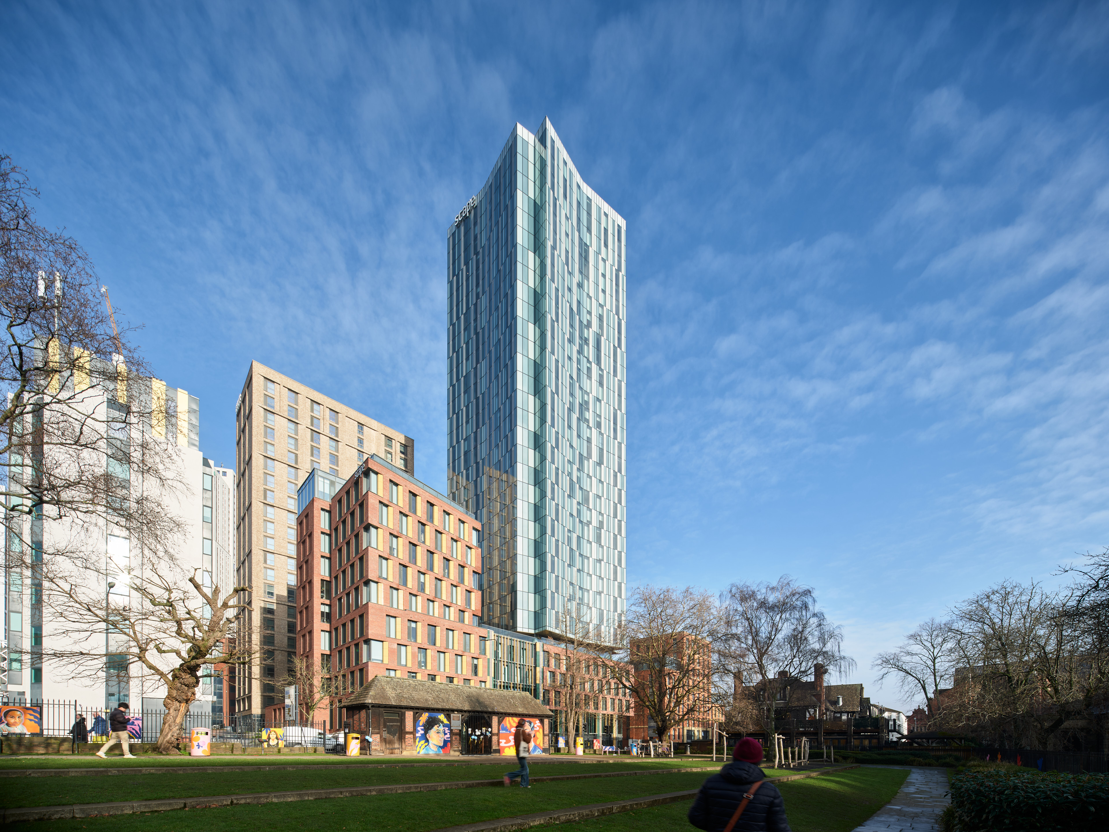 The building is composed of a street scale podium building designed to repair the street edge and step in height to respond to the scale of adjacent buildings. A 32-storey tower sits above, positioned away from neighbouring buildings which has been sculpted to present the same proportions as the spire of St. John’s Church which can be found opposite the site.