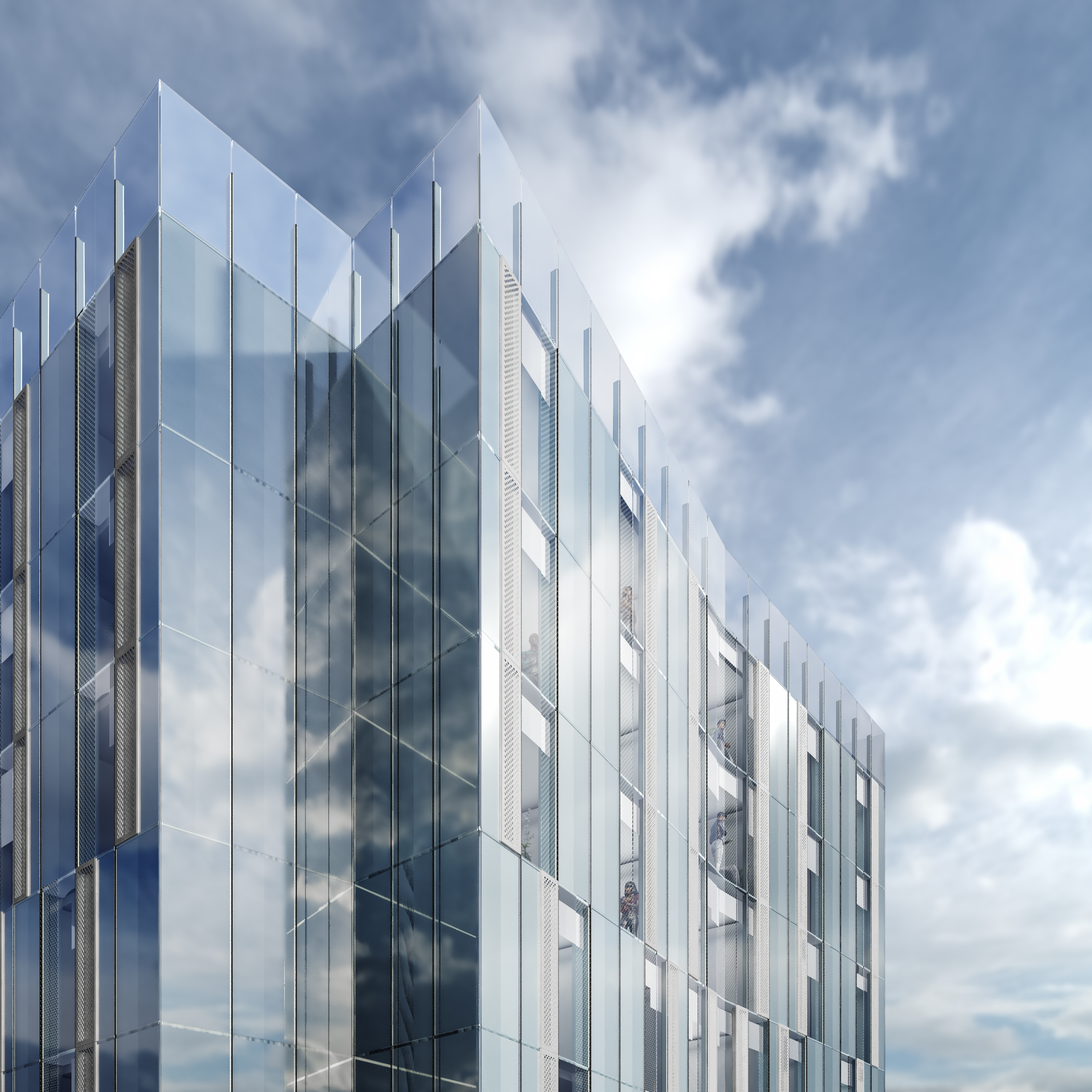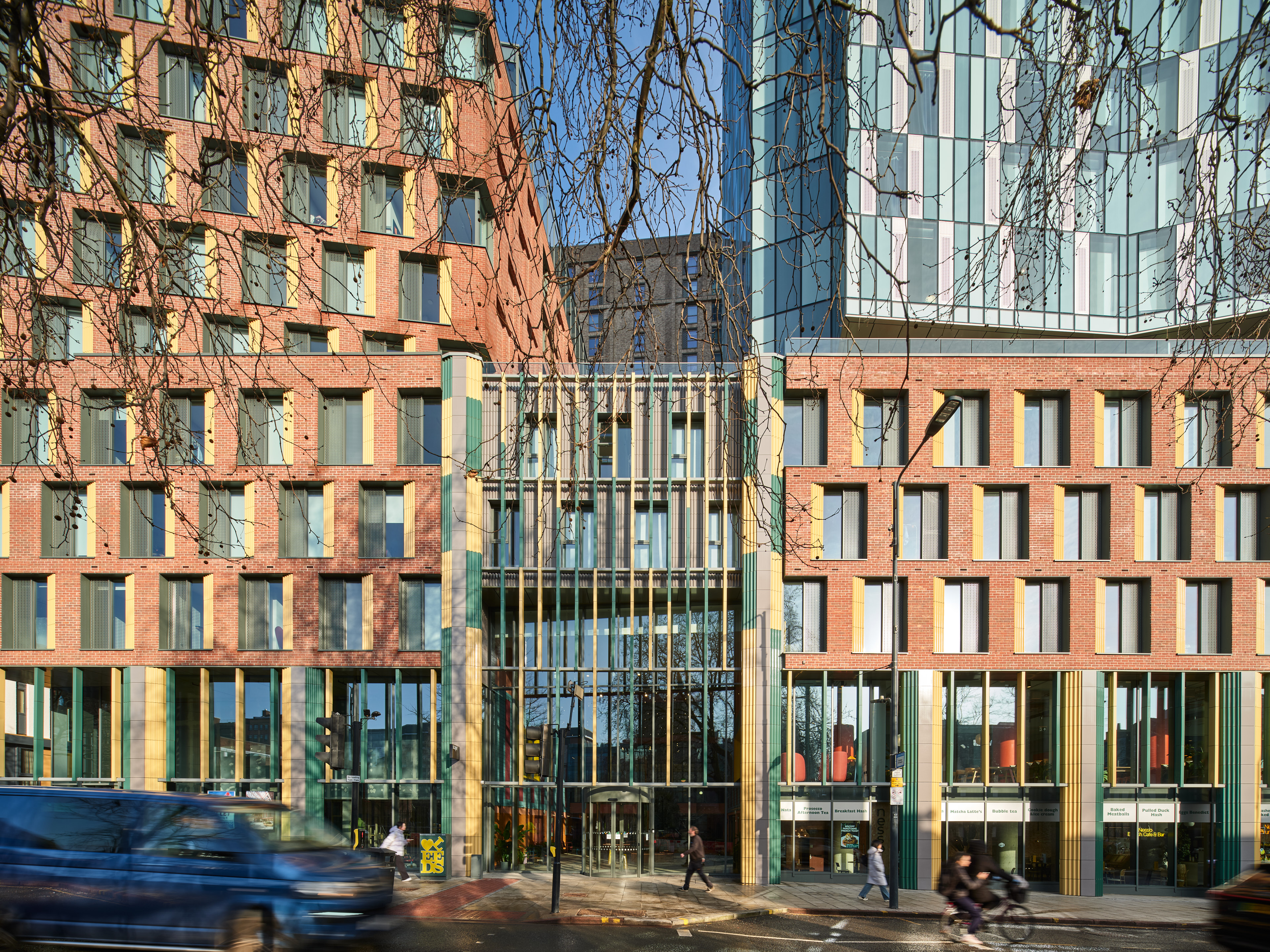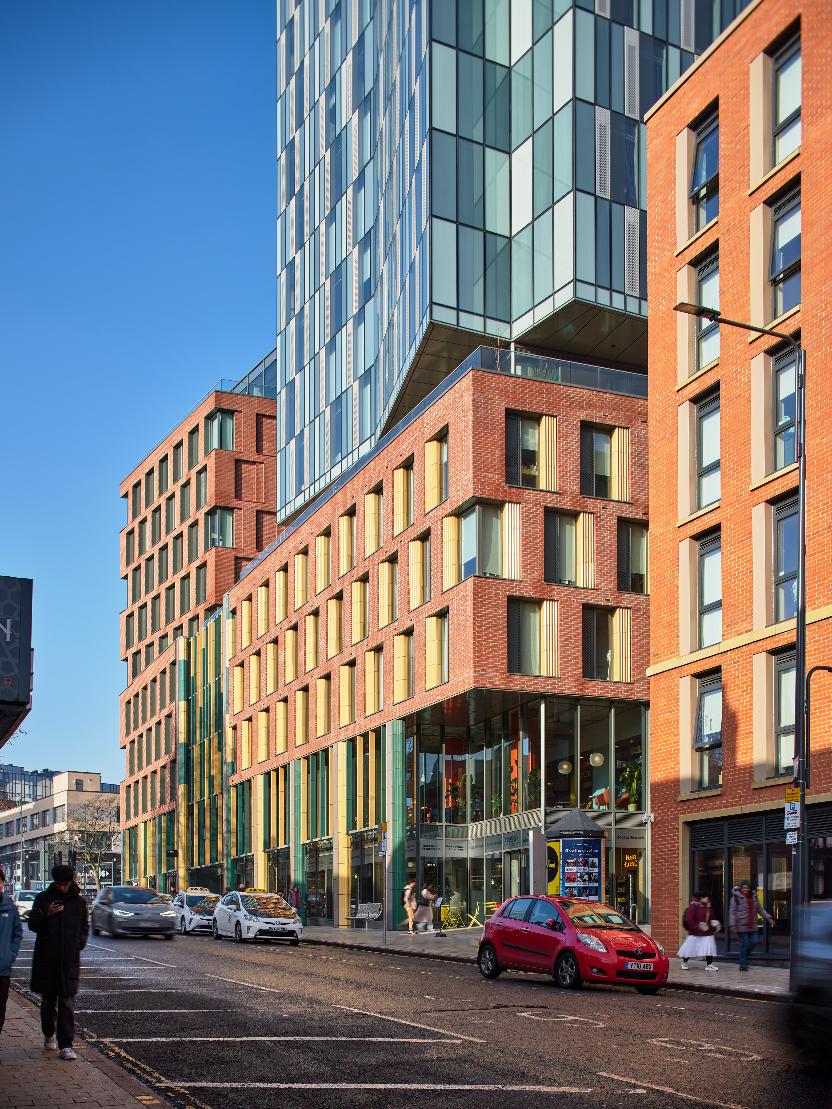The elevational treatments of the podium and tower are intentionally contrasting, with a red brick cladding to the street building and a glass-faced façade to the tower. The podium materiality takes reference from the material and tonal palette of the historic buildings along New Briggate nearby and features glazed ceramic detailing which is inspired by local Burmantofts pottery. The tower comprises insulated opaque glass panels and clear glazing for a ‘lightweight’ and reflective appearance, which reflects the changing light of the day and seasons in the form’s crystalline facets.
