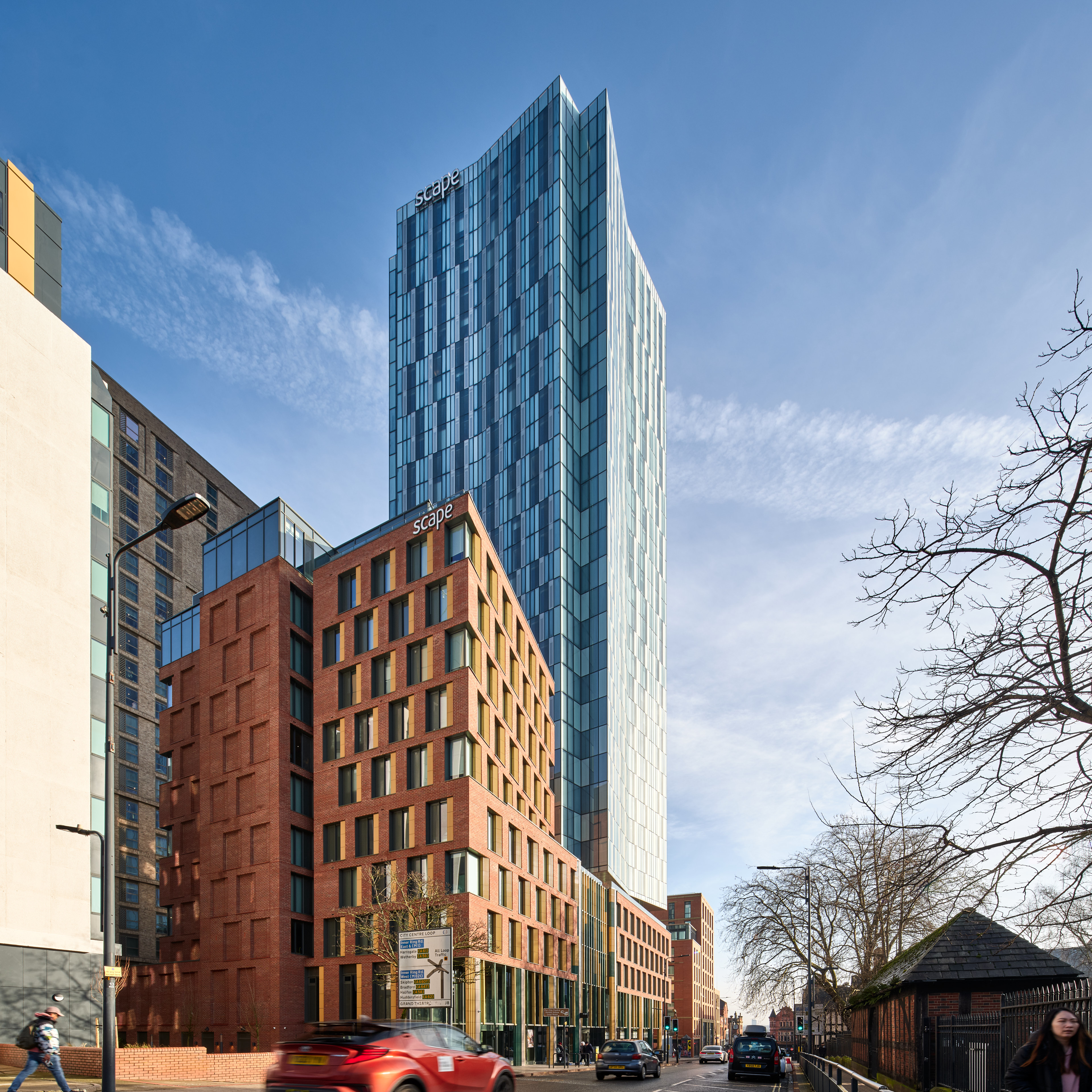 Sited within the northern Arena Quarter of Leeds city centre and near to the city’s universities, this student residential-led scheme forms part of the growing cluster of tall buildings found in the area. Offering world-class student accommodation, a total of 660 bed spaces are provided across a mix of self-contained studios and 5-bed cluster apartments with generous communal living spaces. Students will have access to extensive on-site amenities including a fitness studio, games room, multimedia and cinema rooms, laundry facilities and numerous lounges and study spaces, some of which open out onto private rooftop gardens.