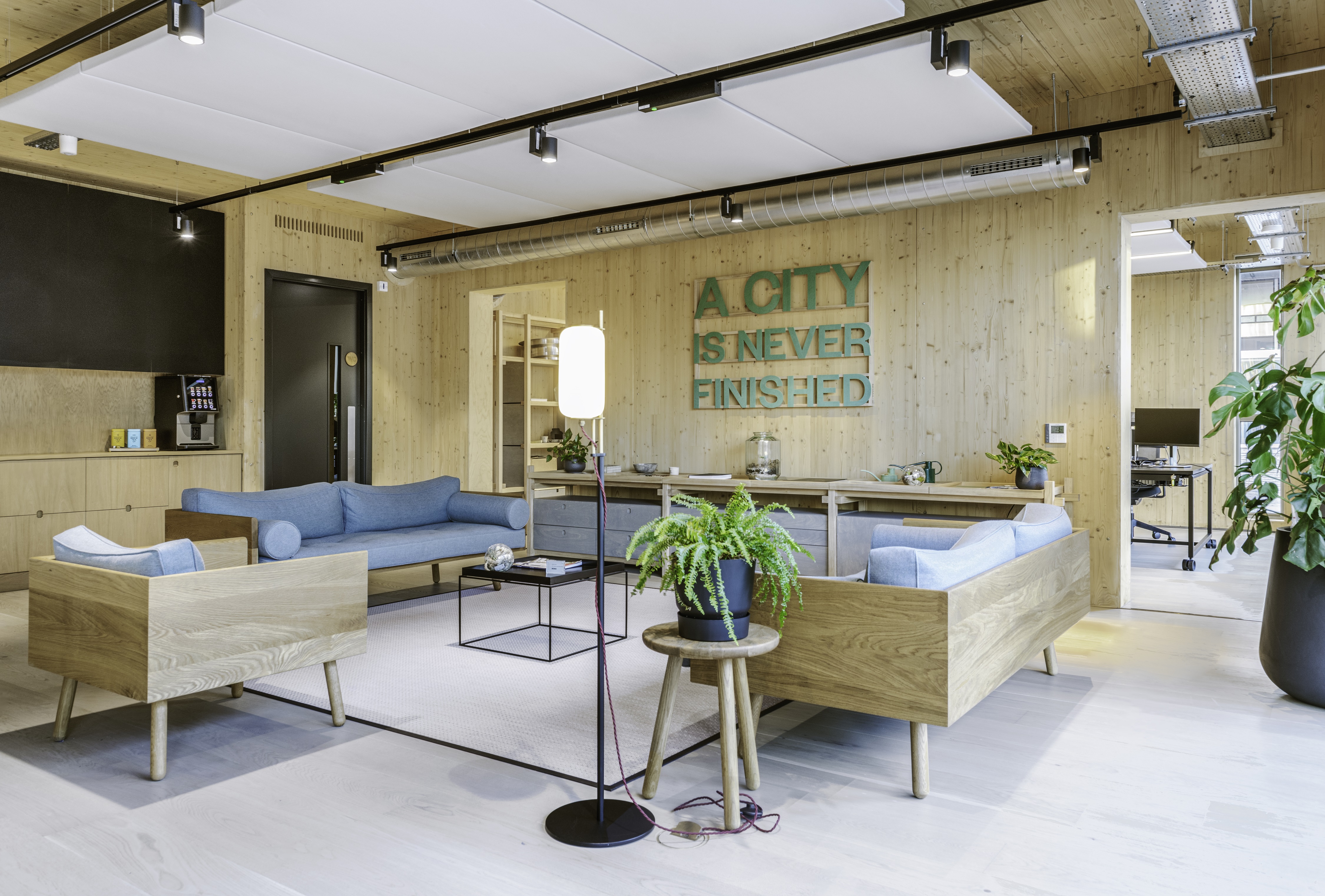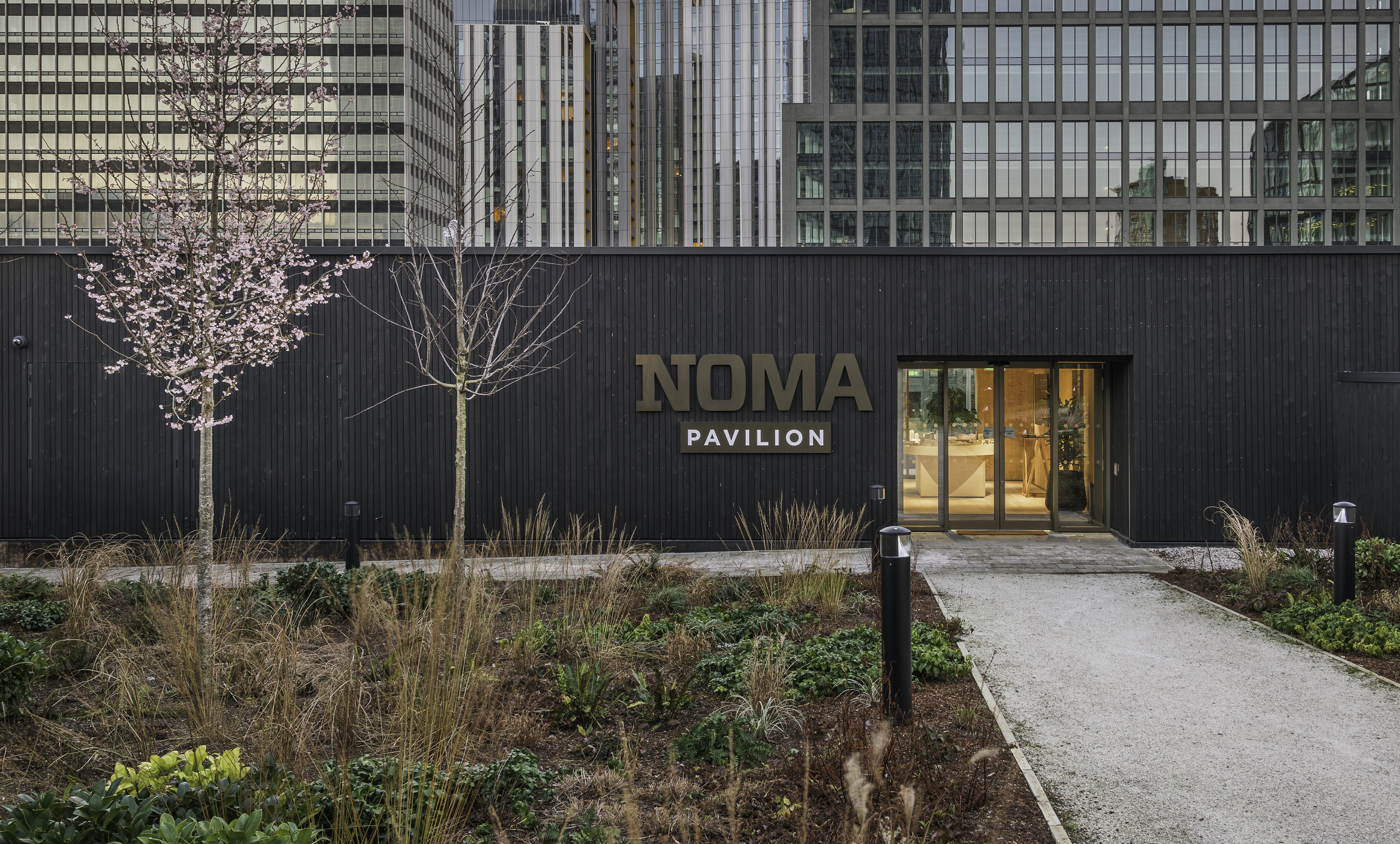 The CLT structure is exposed internally, and the building is clad externally in charred timber which gives an intriguing light and dark contrast between interior and exterior. The Pavilion has a high-performance external envelope, and energy for the building is generated via a rooftop photovoltaic (PV) array. Through this use of primarily natural materials and highly energy efficient design, the Pavilion is a showcase of the exemplary sustainability aspirations of NOMA.