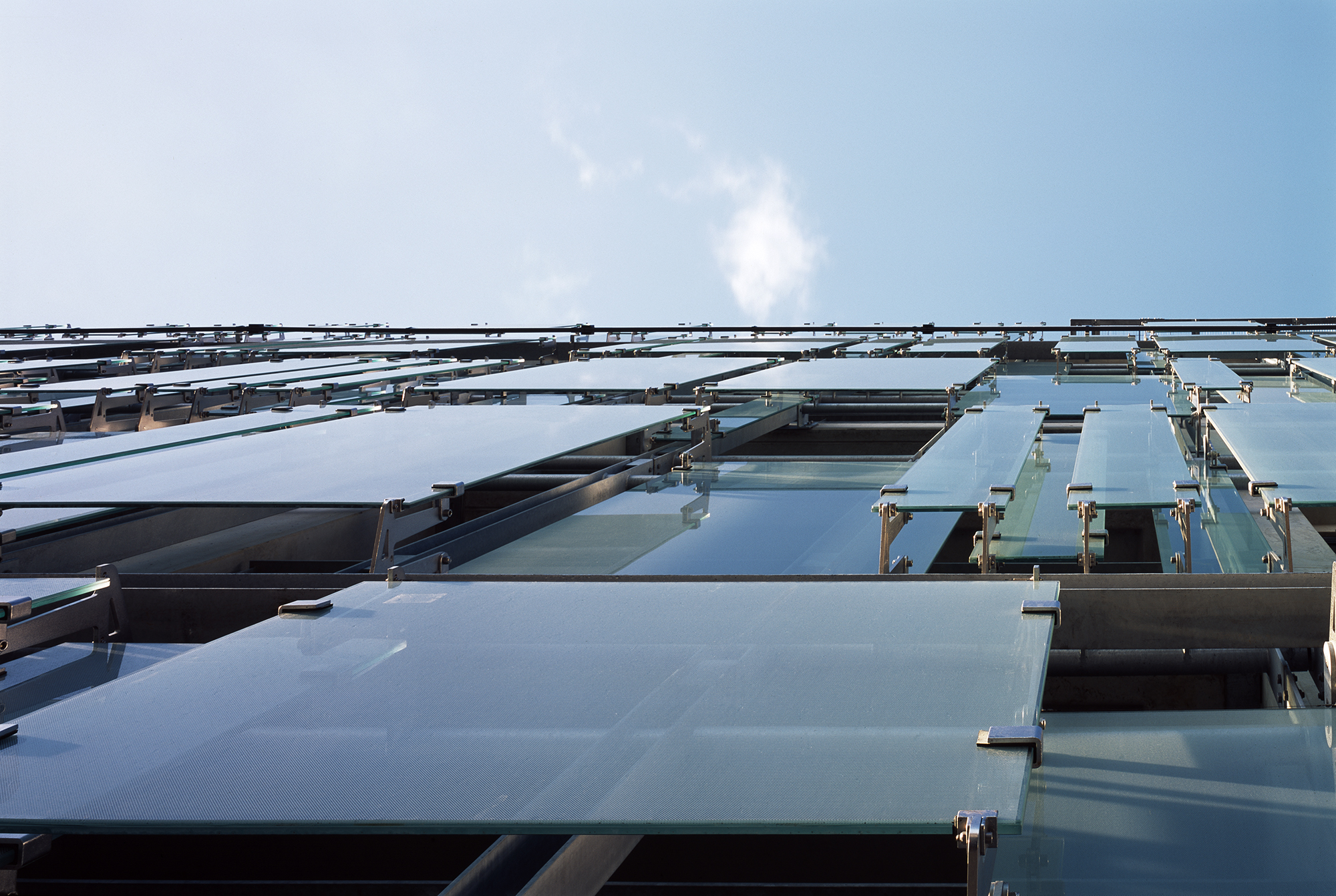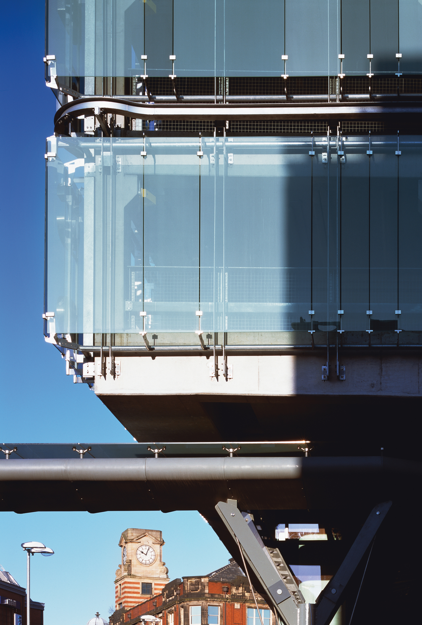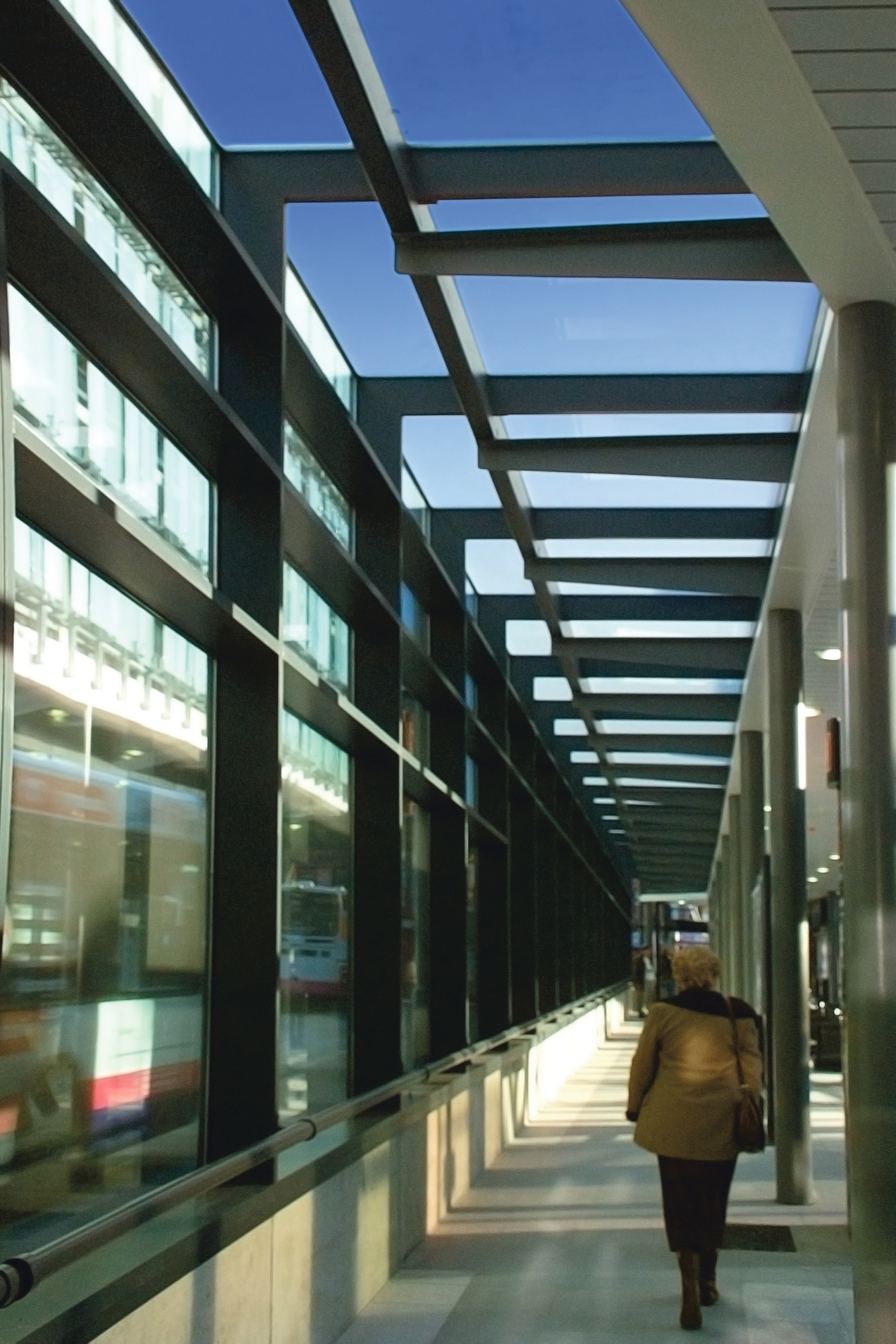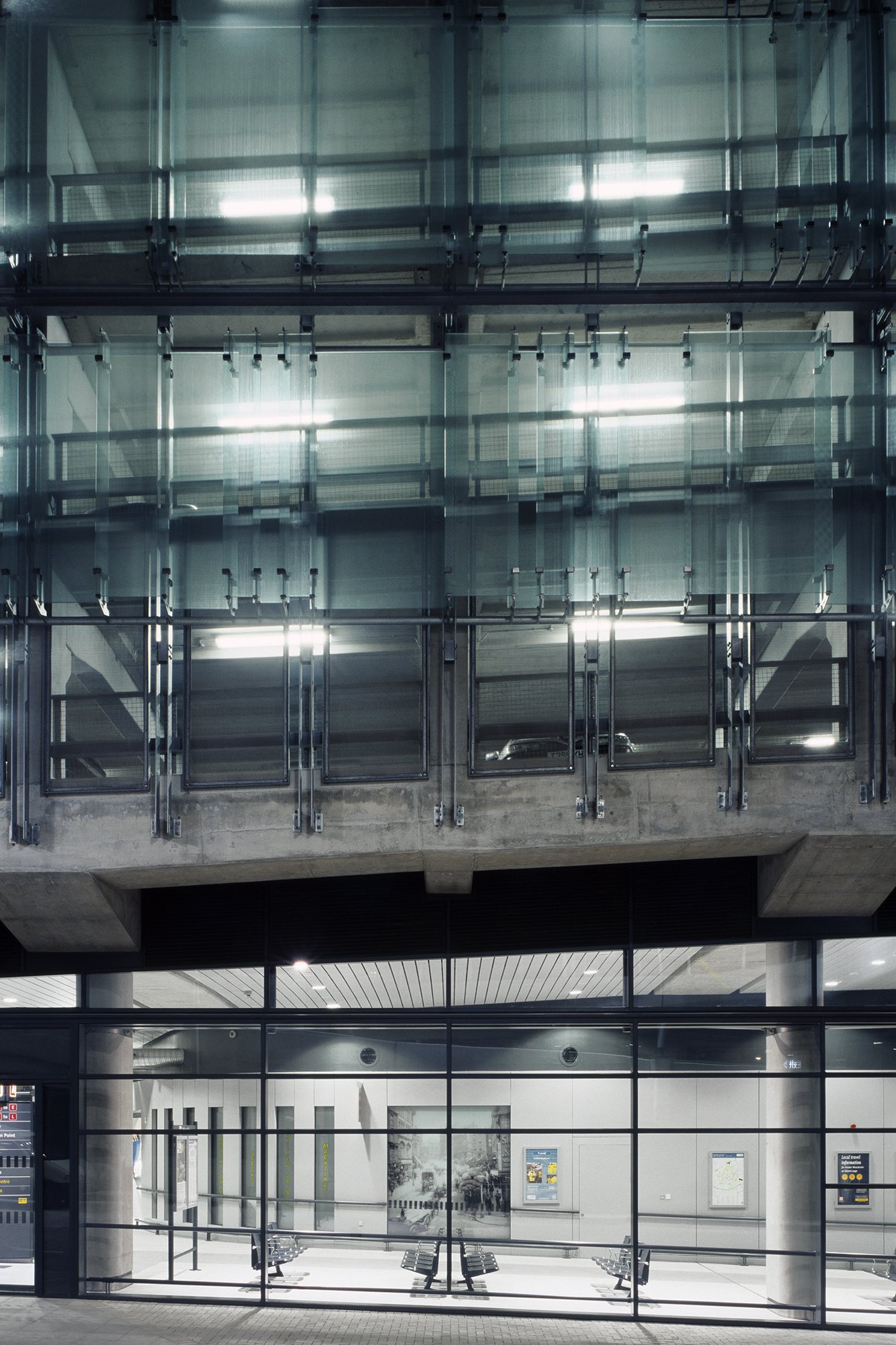 The car-park envelope consists of fritted glass panels in a variety of modules that are held in alternating planes, with the result that the horizontal ordering of the façade is overlaid with a contrasting geometry of movement and vitality. This visual interest is enhanced by the shadows of movement behind the glass. Pedestrian areas are welcoming public spaces enclosed with lightweight glass and steel structures.