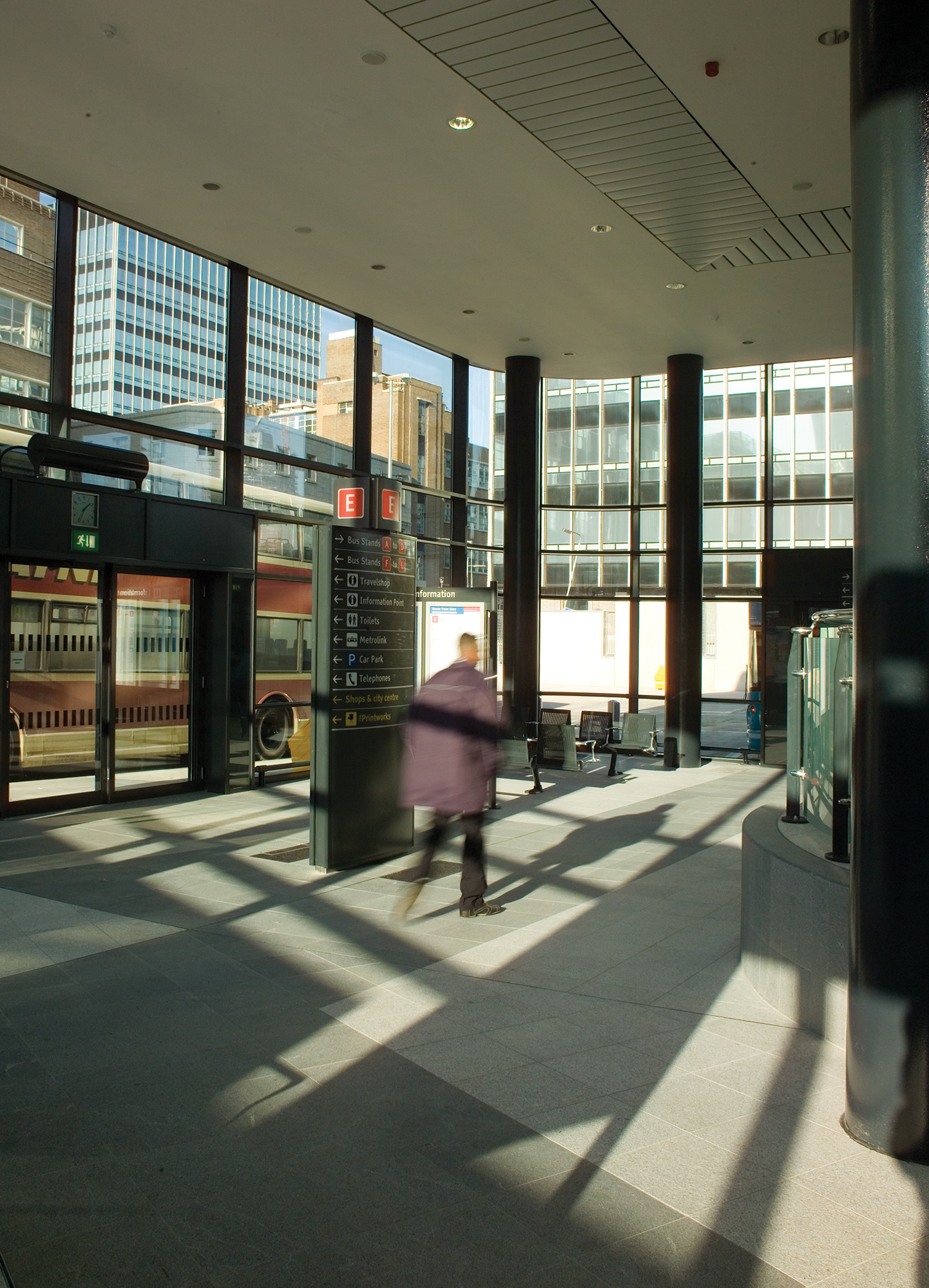 The concourse follows the 3m slope across the site and this change in level prompts the highly efficient tilting floor plates of the parking levels above. At ground level, a steel and glass ‘aerofoil’ canopy provides shelter to the tram stop and defines the primary pedestrian circulation. Clear glazed waiting areas are aligned with the bus stands and there are two metal and glass pod structures enclosing offices, shops, a travel centre and a café.