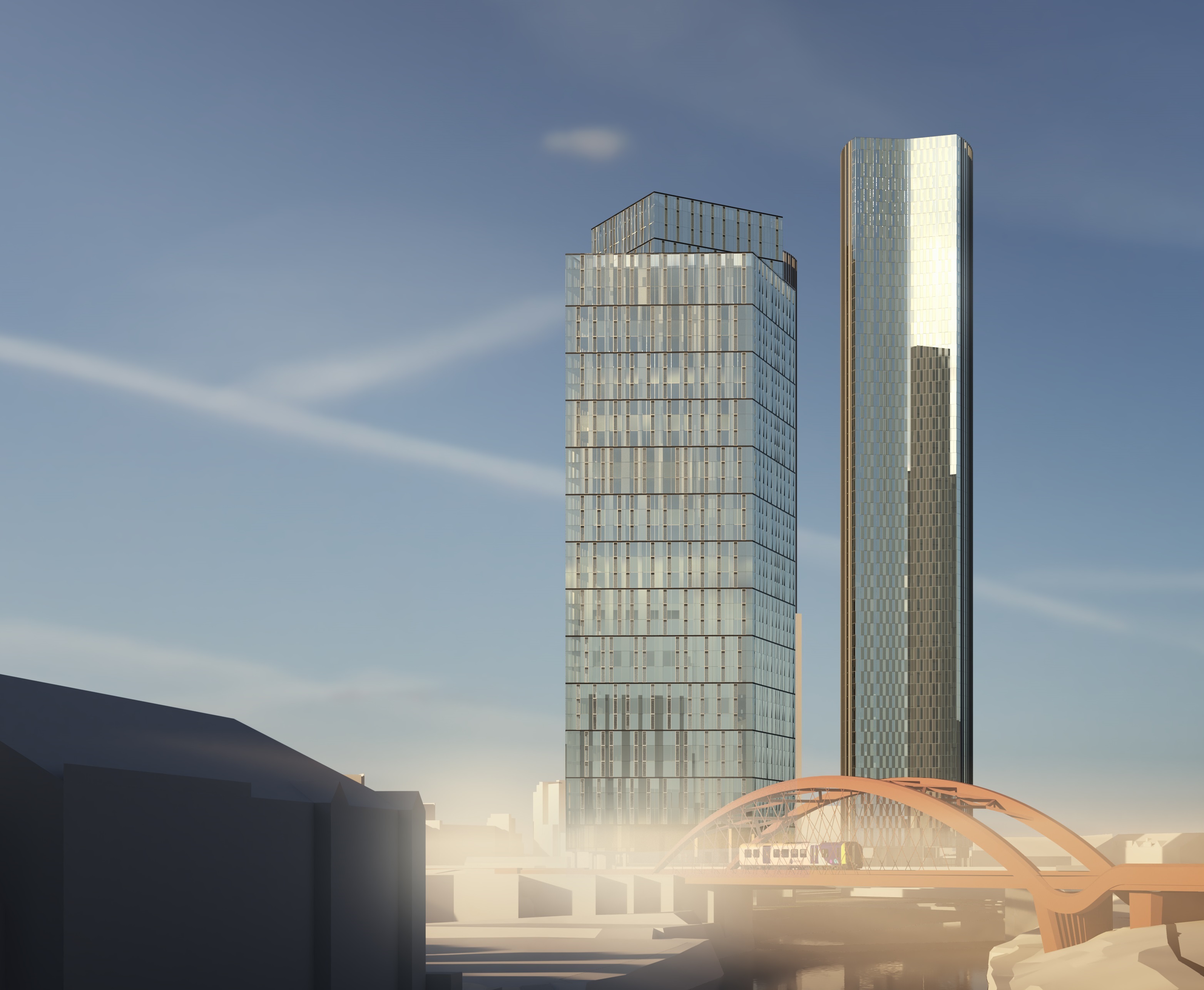 On Site D the towers have a curved appearance with concave and convex geometry on opposing faces, enabling the taller marker building to lock into the natural curvature of the River Irwell. The inflected facades provide a contrast and generate a slender overall tower form.