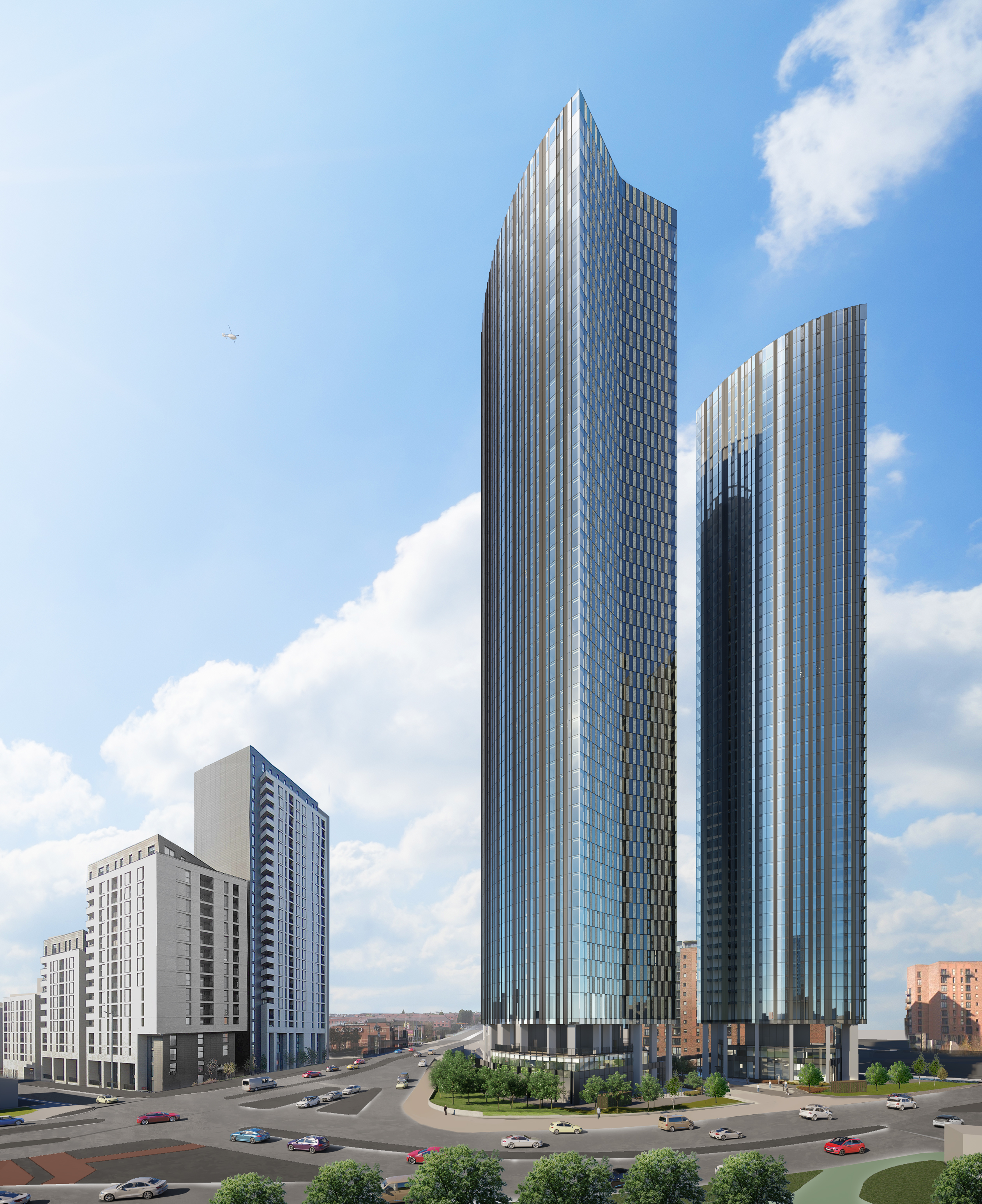 The Trinity Islands proposal will deliver 1,950 new, high-quality homes across four residential towers of heights varying from 39 to 60 storeys, transforming the former car park which is currently established on the sites. The proposed development uses pairs of different and unique building forms to provide identity to each site within a cohesive whole.