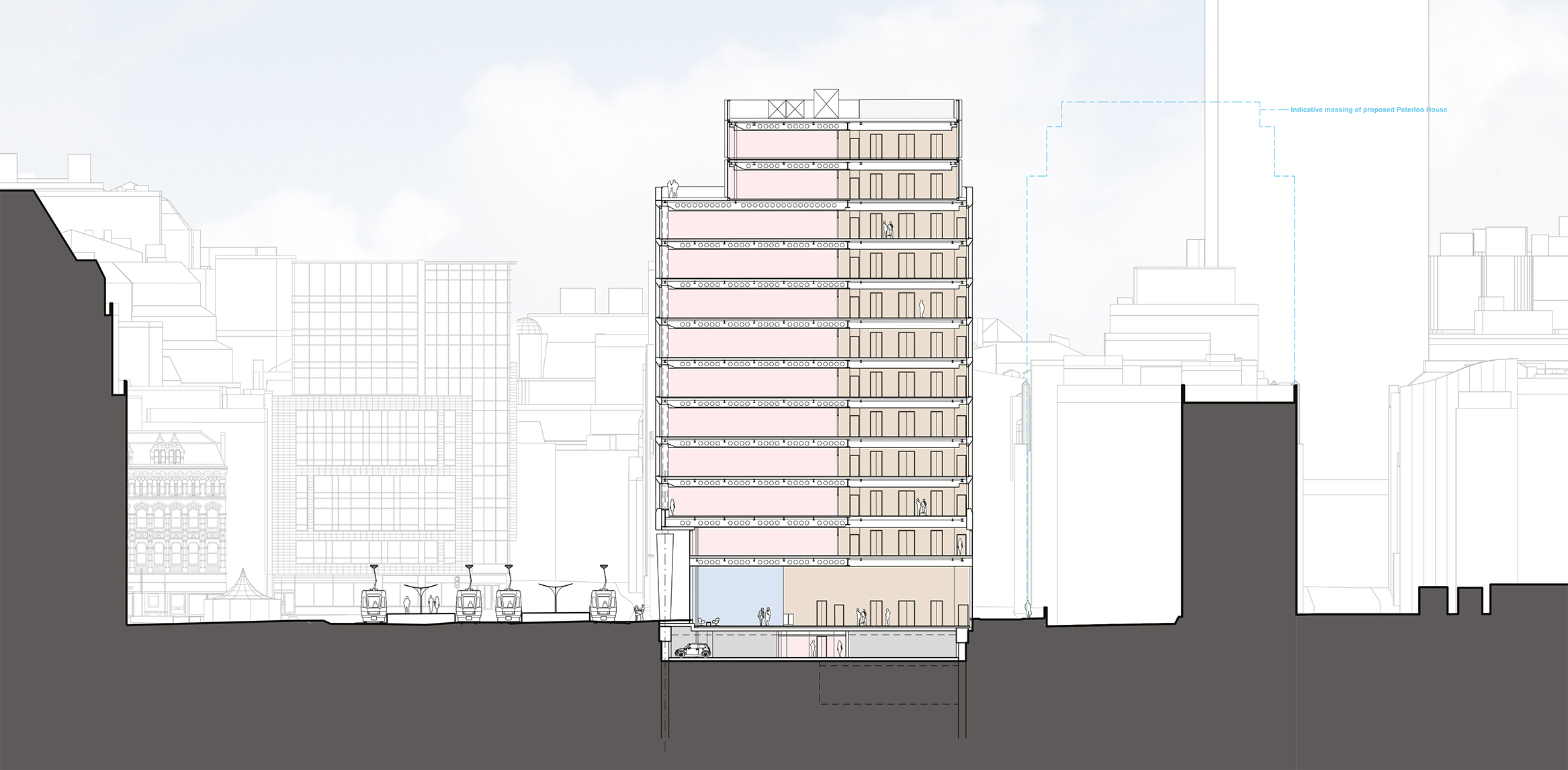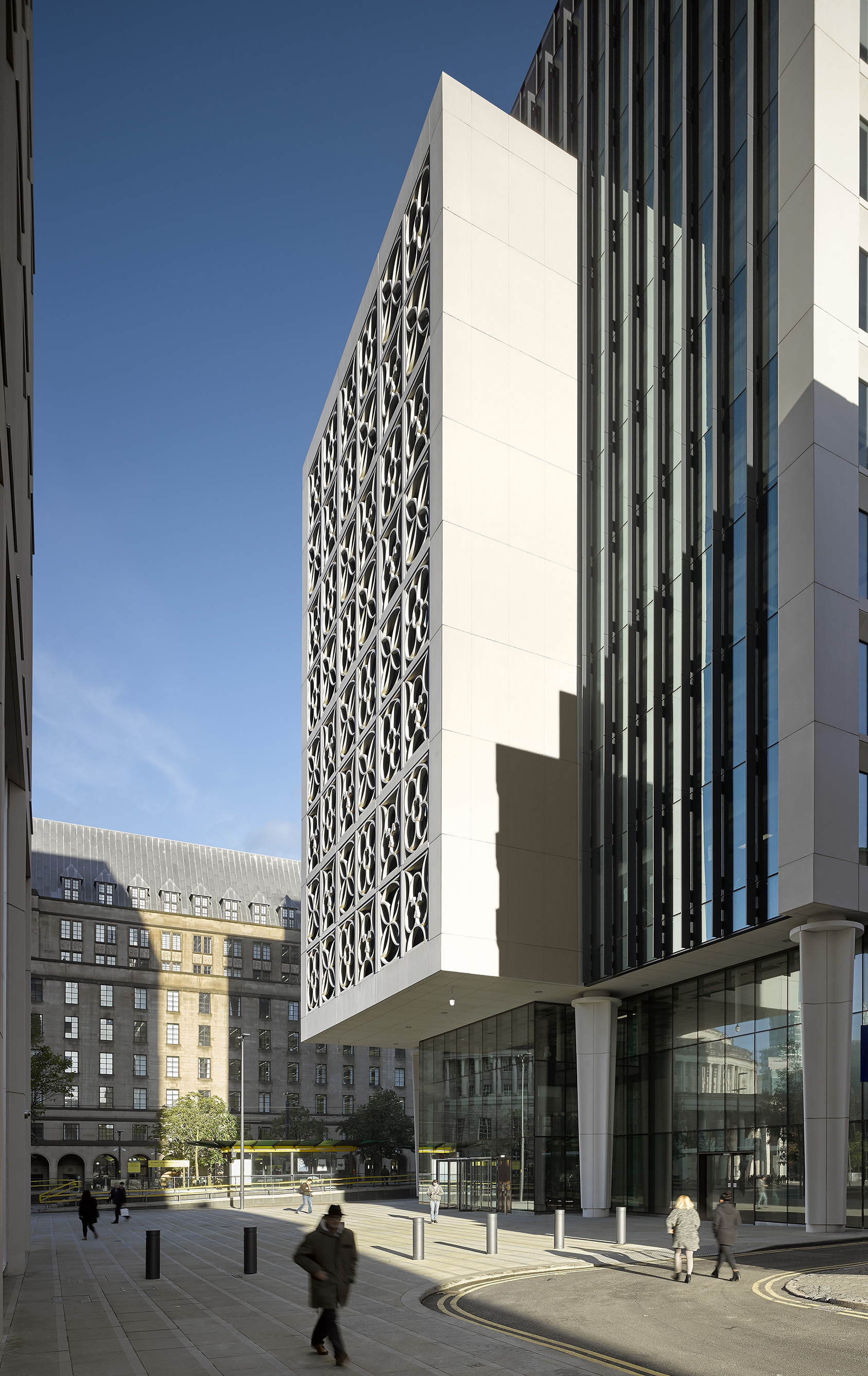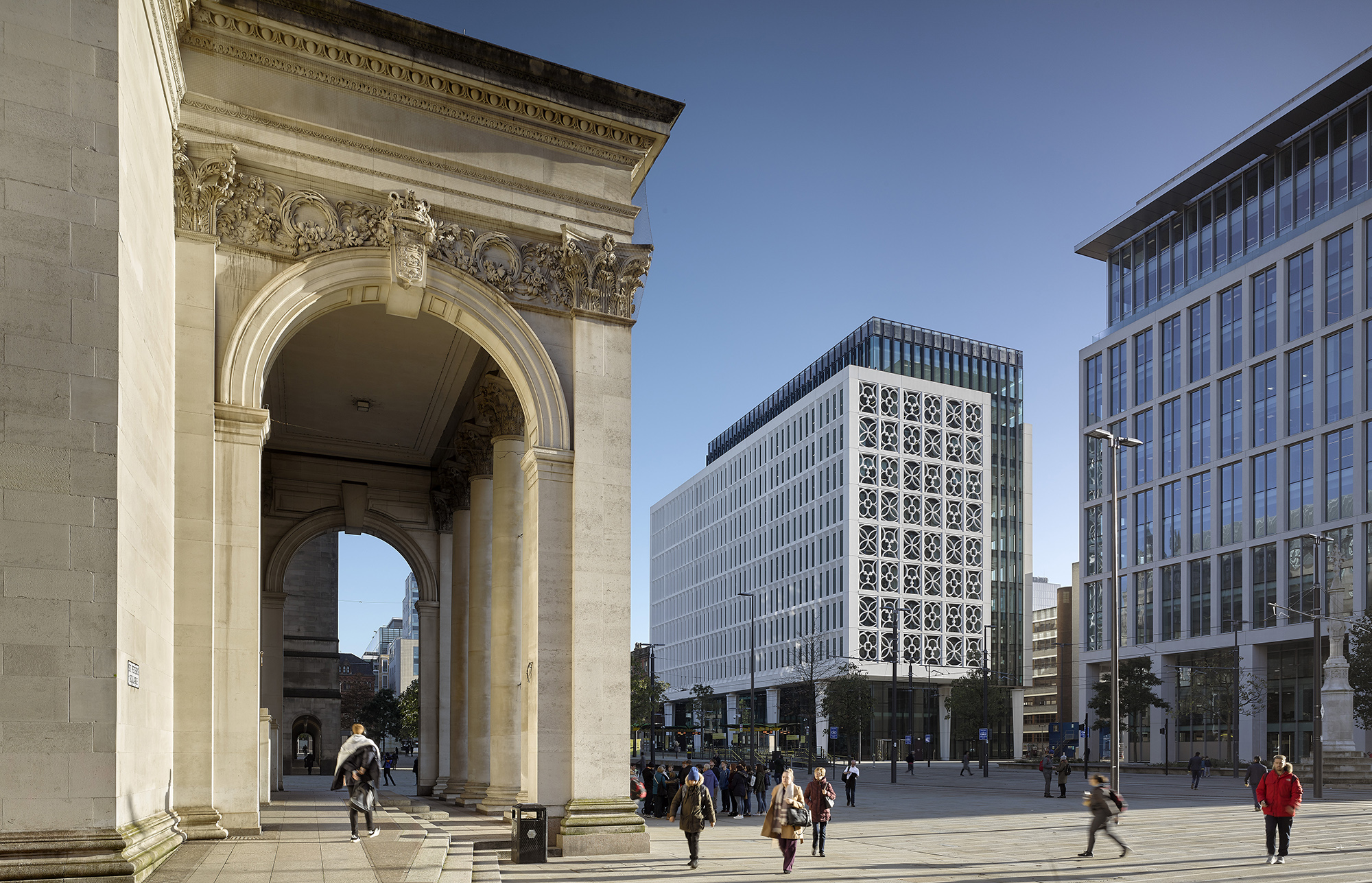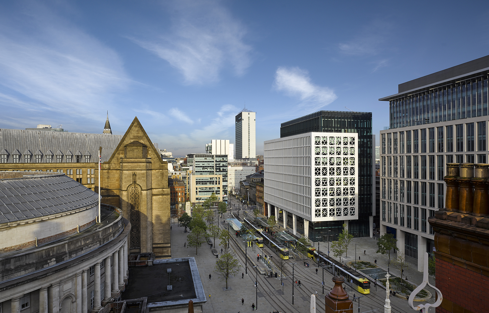 Following an international design competition, the square has been transformed into an open and welcoming public space, creating new connections across the square and with the surrounding city. The redevelopment of its south-eastern side, and Two St Peter’s Square in particular, has introduced renewed commercial activity and contemporary architecture of a quality and scale to complement the grandeur and character of the historic buildings, strengthening the entity of the square and its presence within the city.