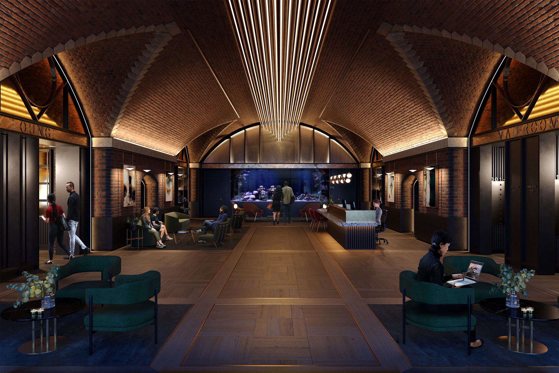 At street level, the majestic Grade II listed arches have been transformed into characterful amenity spaces for residents, including a swimming pool and spa, a lounge, and the resident's entrance lobby, featuring an impressive aquarium with 350 fish!