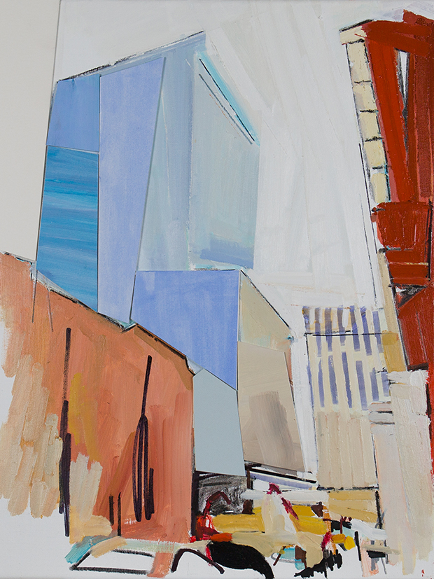The commission came about when I first encountered Colin at the launch of the exhibition ‘Cityscapes/ Wordscapes’ held by Contemporary Six in June/July 2015. I had previously been aware of his landscapes and was now so taken with his urban work, the strong and assertive use of line and colour, that I purchased a painting ‘The River Dene’, an elevated view along Deansgate with which I am so familiar through living at one end and working at the other. The painting is now hung in my apartment at No.1 Deansgate, it reflects the inverse of my view out.