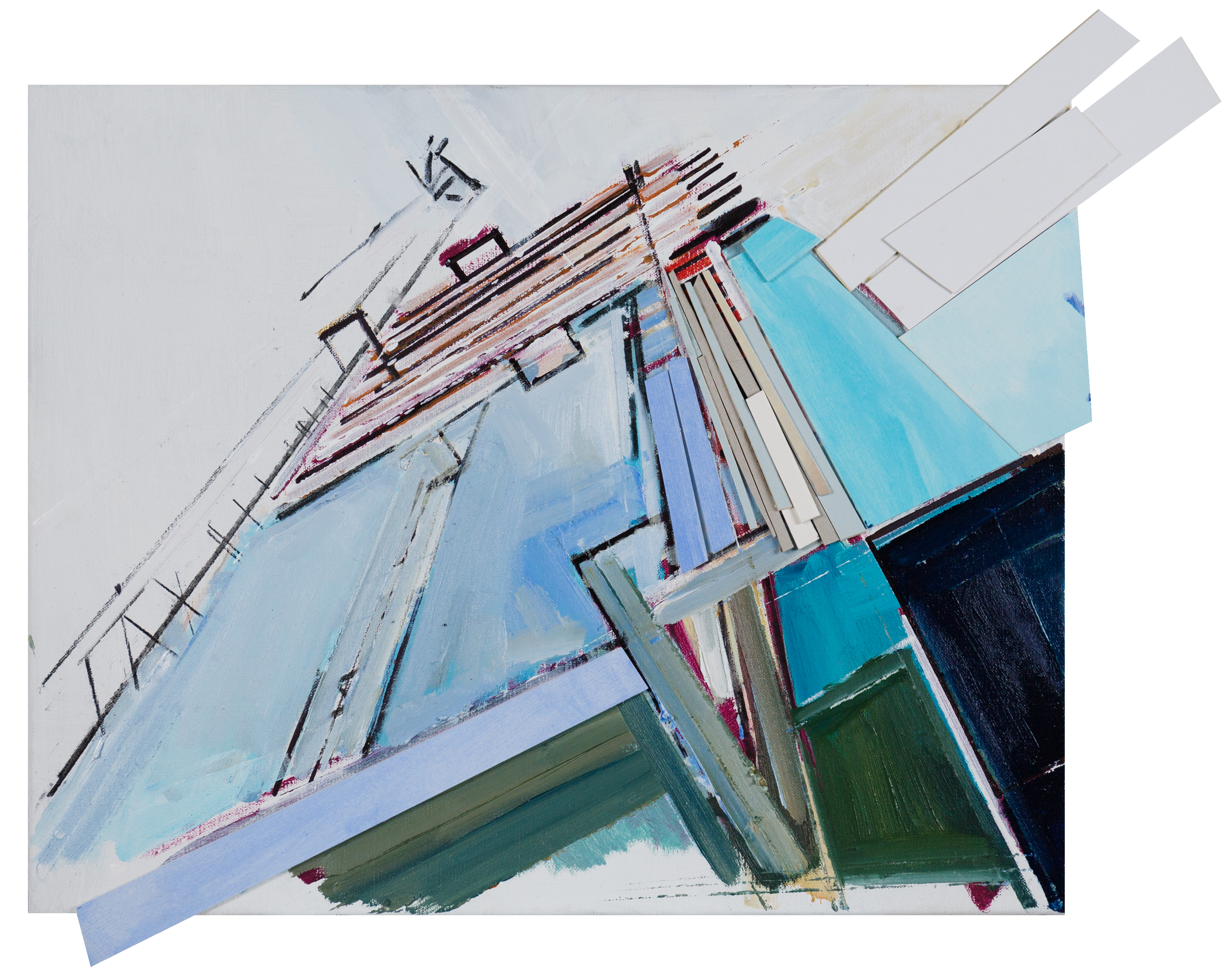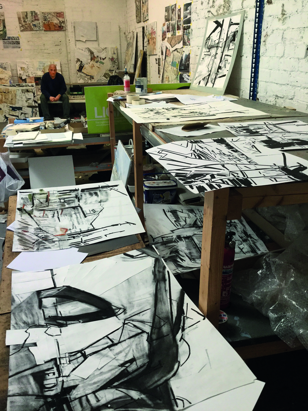 During the opening evening, an idea formulated in conversation with Colin, a notion of recording, through canvas, paint and the drawn line, the construction of our proposed building at No.1 Spinningfields, that was just about to start on site. The timing was fortuitous and the notion of representing and interpreting the building through the eyes of an artist like Colin appealed to me greatly, a more abstract, graphic, painterly approach seemed a natural way of interpreting the art within architecture and a celebration of the creative spirit.