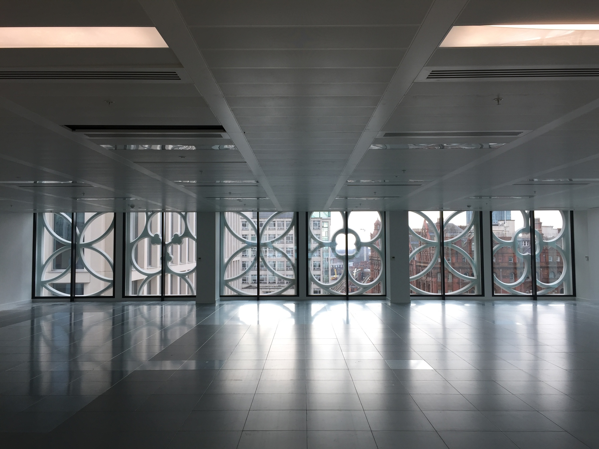 The south west façade frames the newly defined St Peter’s Square when viewed alongside its counterpart of stone filigree found on the opposing Town Hall Extension stair. Three individual patterns are used to articulate this elevation and are derived from symbols of Manchester’s heritage, interpreted from air bricks carved into the Town Hall itself. Depicting local icons such as the cotton bud and the Lancashire Rose, the tracery forms a natural shading device to the full height glazing located behind. On Princess Street the design draws on the contextual references of the textile warehouses it overlooks, using a single abstract interpretation of the cotton plant with sepal, bud and stem. This motif is repeated and rotated over the surface of the elevation, offering a rich articulated backdrop to the adjacent listed buildings.
