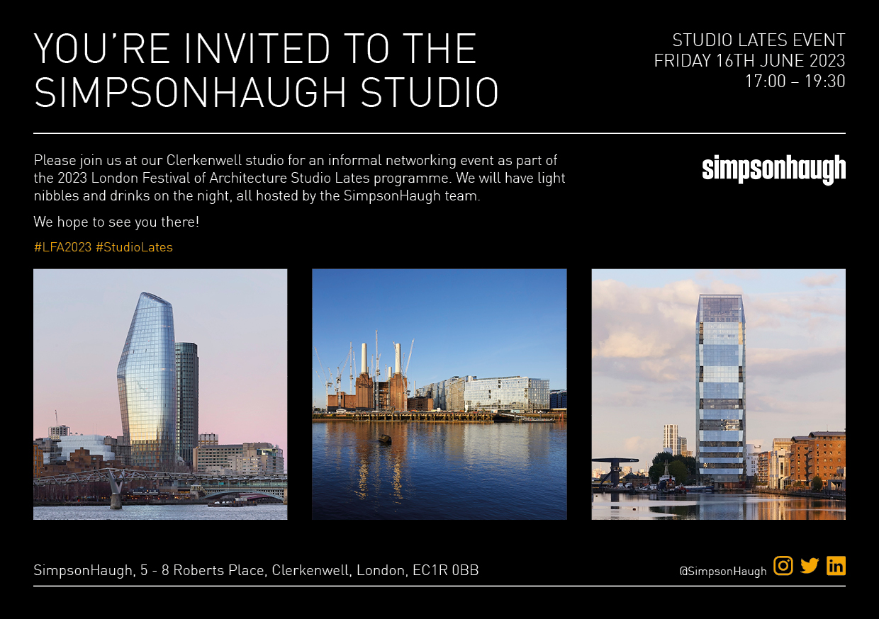 This year SimpsonHaugh are taking part in the London Festival of Architecture annual Studio Lates event. The Studio Lates programme is held in four different areas of London on Fridays in June. On Friday 16 June we will be joining the other studios in the Clerkenwell area opening their doors. Join us at our Clerkenwell studio for drinks, nibbles, and a chance to explore our practice's work and meet the team. The event will be open 17:00 - 19:30 - all are welcome!