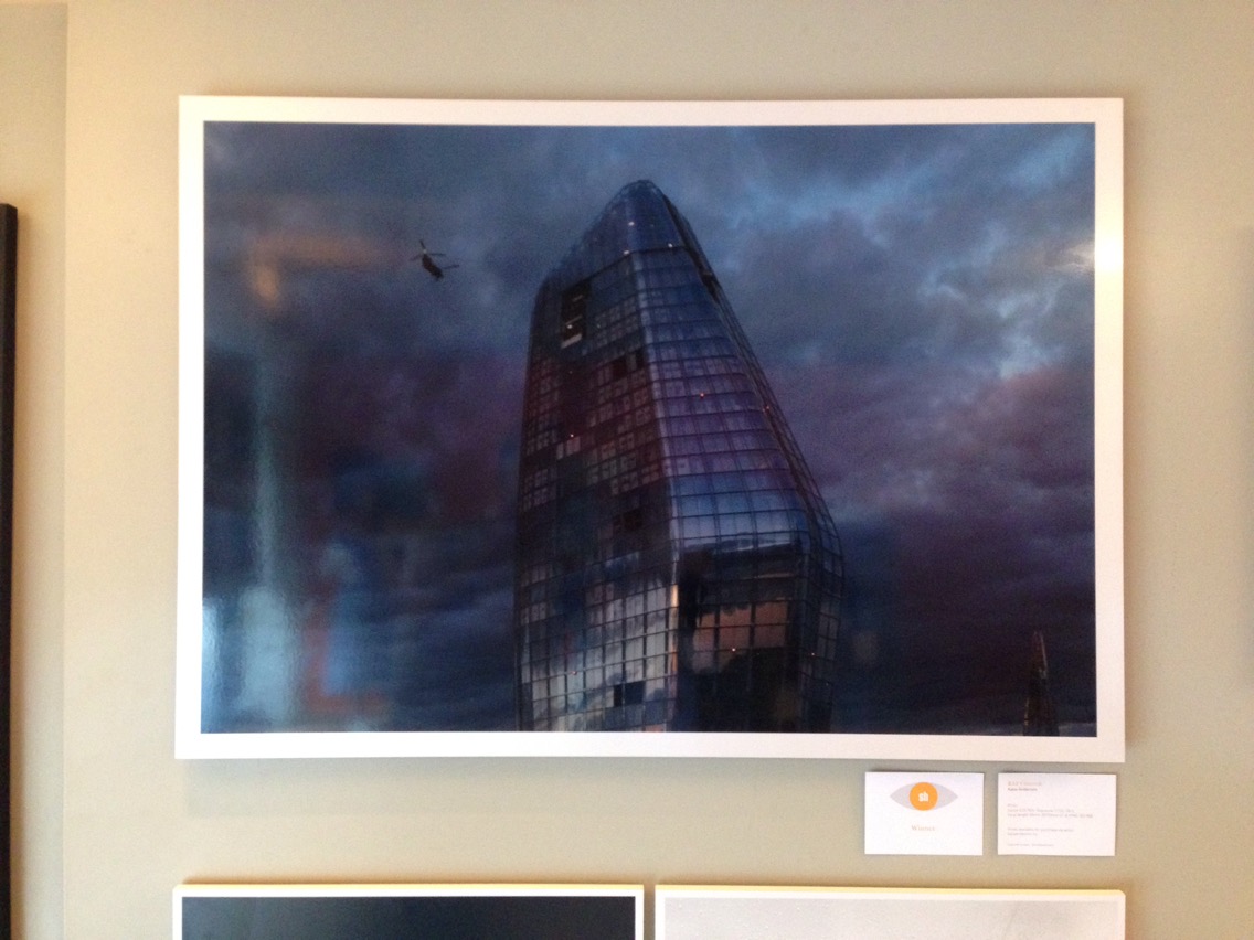The exhibition also included a competitive element. Our team of judges – SimpsonHaugh’s David MacDonald and Matthew Ayres, and Caro Communication’s Diane Hutchinson – spent an afternoon debating the merits of each piece in order to pick which they thought provided the most surprising, fresh, unconventional and unique view of our building/s. The judges' chosen winner is Katie Anderson’s “RAF Chinook”, a thoughtfully composed photo of One Blackfriars, which they found visually arresting, especially the opposition of the Chinook and the Shard, and the lighting and reflections.