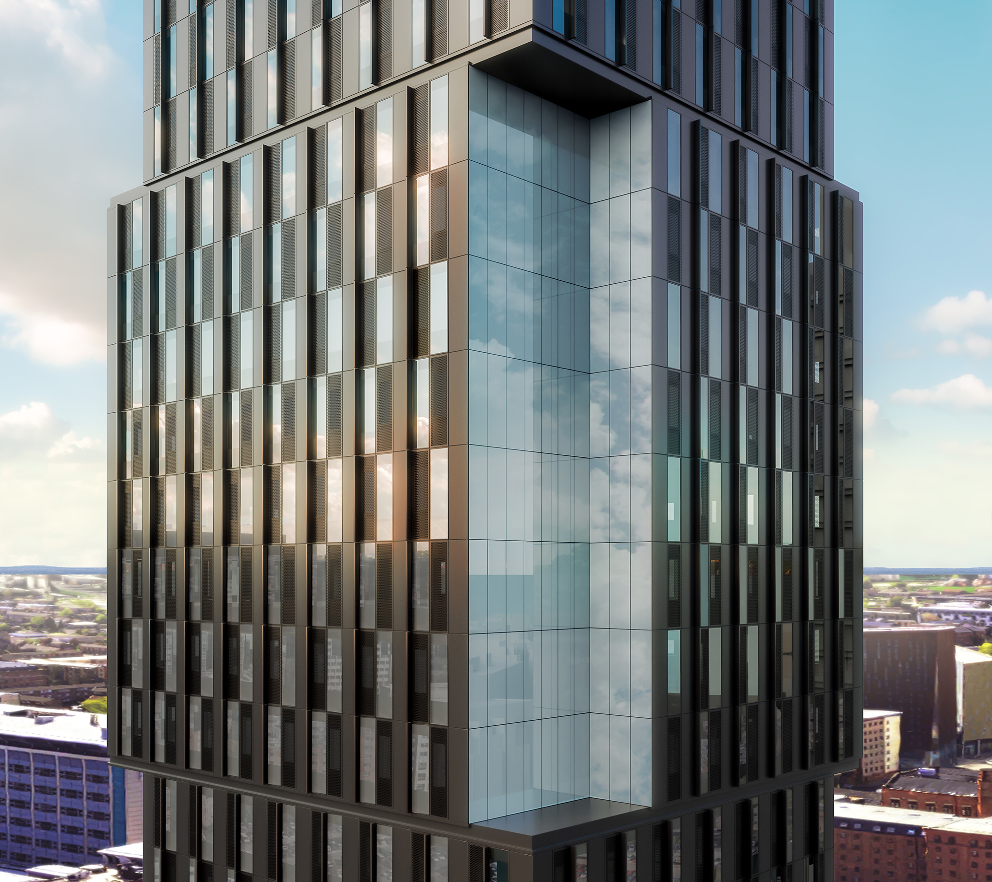The student accommodation tower in Manchester’s city centre will soon be known as ‘Artisan Heights’, in reference to the site’s background in machine and tool manufacturing. It’s anodised aluminium façade incorporates perforated panels which take reference from the cast iron ventilation grilles of the iconic Principal Hotel. Comprising of 603 bedrooms and studios, students will have access to a range of amenities including study, meeting and entertainment rooms as well as lounge areas with incredible views on level 32. We’re looking forward to see the project continue to progress toward completion later this year!