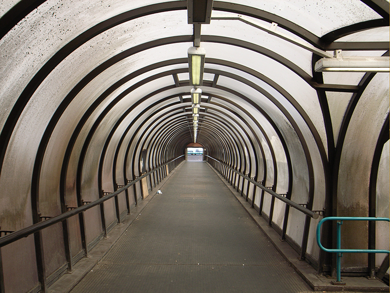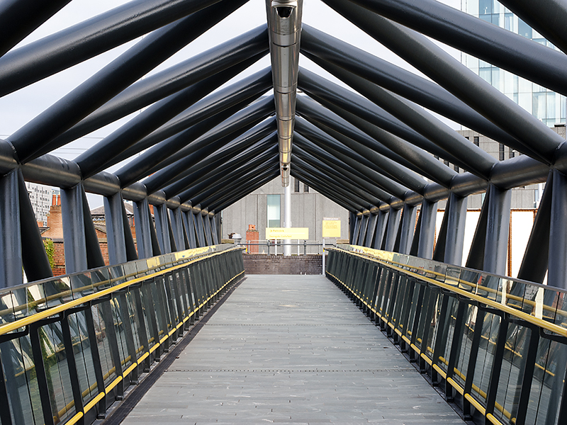 Deansgate-Castlefield Metrolink Stop: The footbridge connecting to the rail station is transformed into an open, airy and vibrant place that offers a sense of arrival and connectivity to the surrounding area via views out to the city
