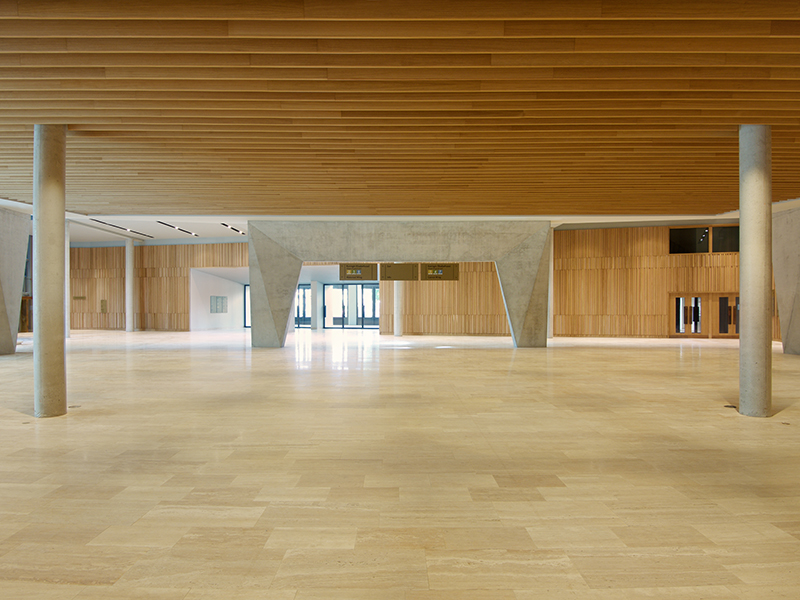 Queen Elisabeth Hall: The Looszaal today, a new public space connecting the site’s different cultural activities with Astrid Square, complements the auditorium using natural finishes such as timber, travertine and bronze