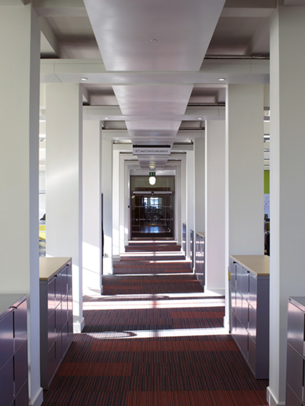 Town Hall Extension: Refurbished office corridor with new interventions, such as the service rafts in the office areas, are clearly contemporary but combine effectively with the listed fabric