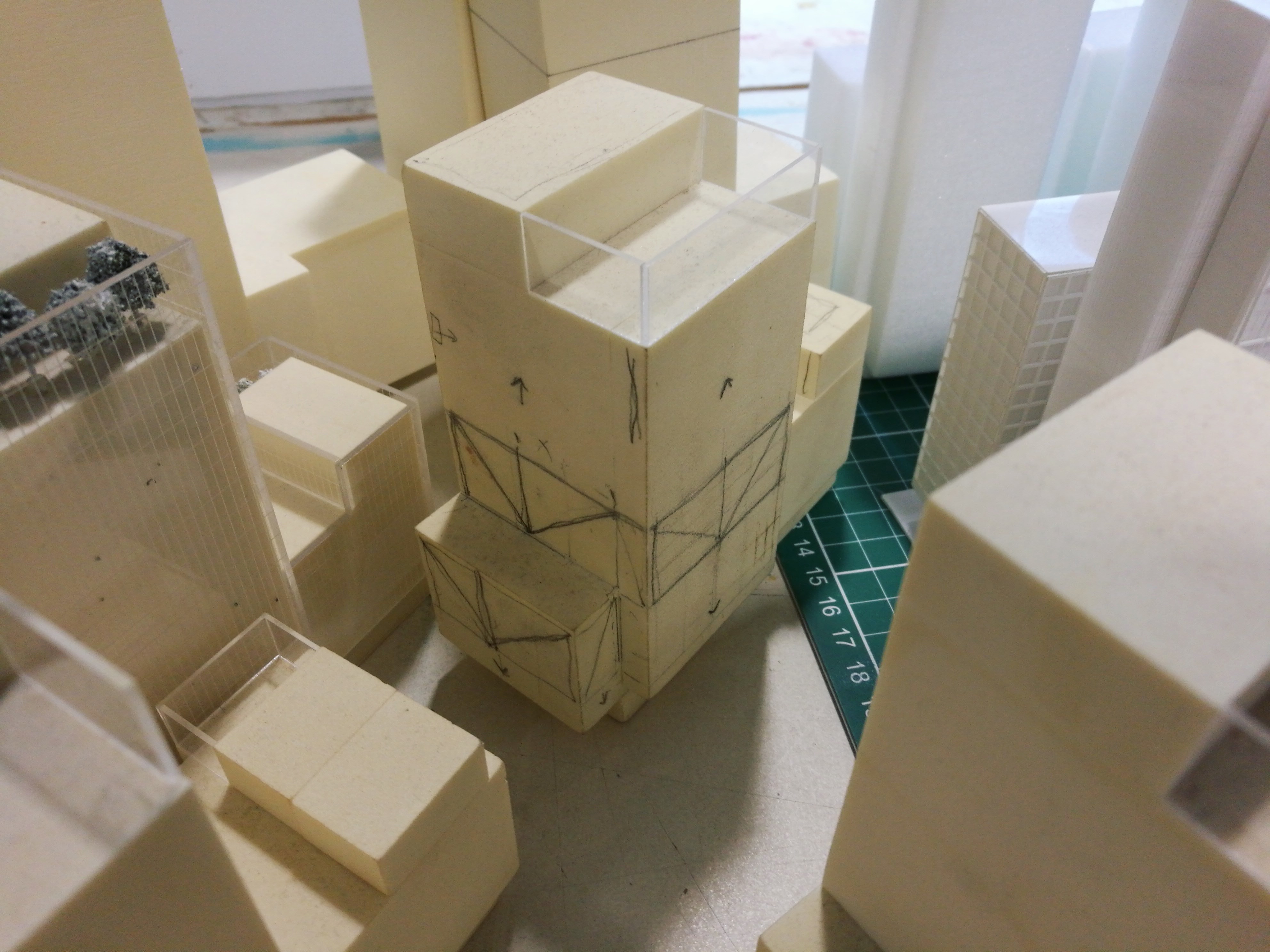 As a model maker, I work alongside architects through several design process cycles - idea, sketch, model - in order to resolve and refine a building proposal. A physical model shows what works and what doesn't. It allows us to explore and generate ideas, to understand three dimensional space in a way no other medium can, and encourages us to think both horizontally and vertically. While developing the massing for No.1 Spinningfields, models allowed us to explore how the interlocking forms responded to each other, what spaces were created between the volumes and how the structure would work.