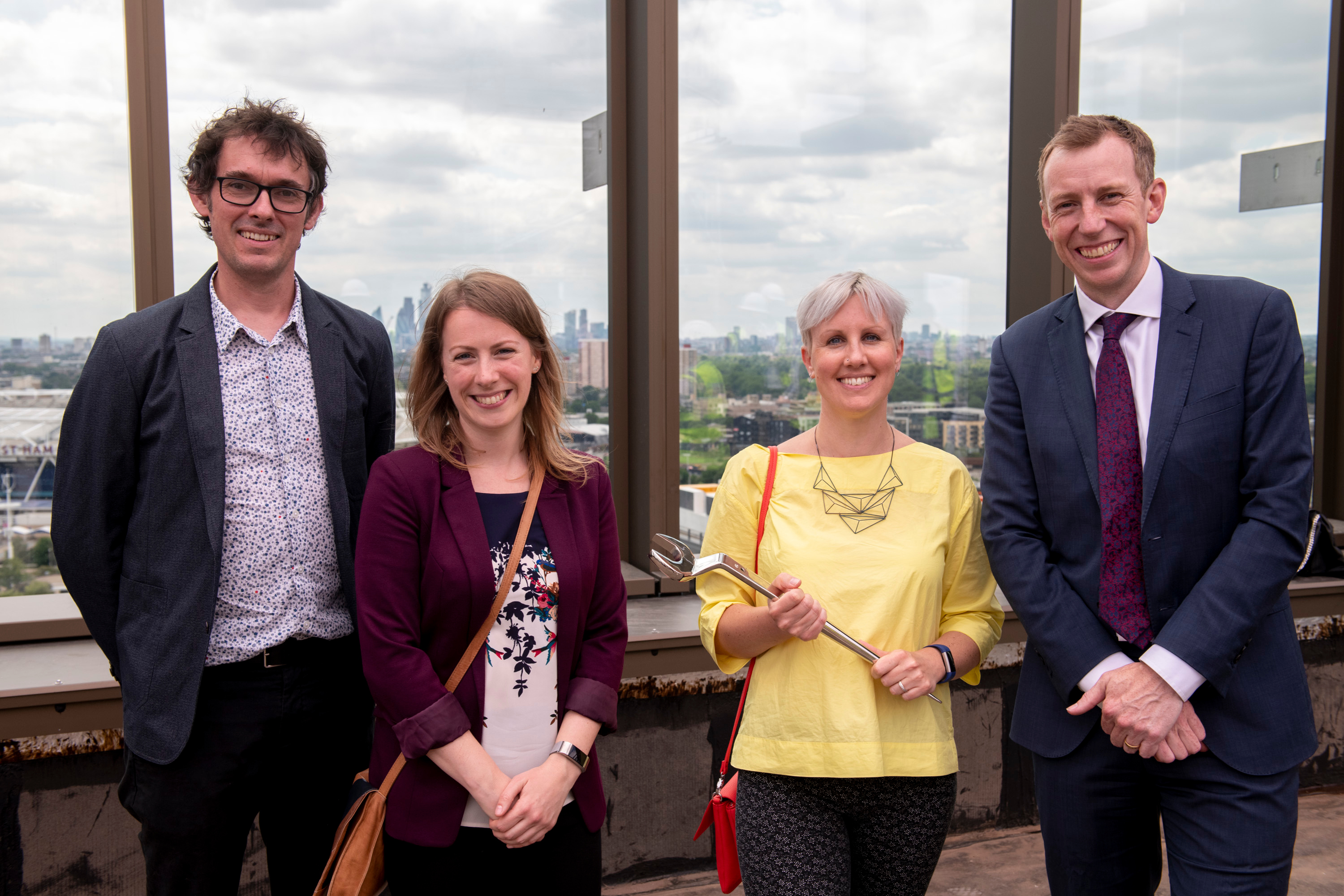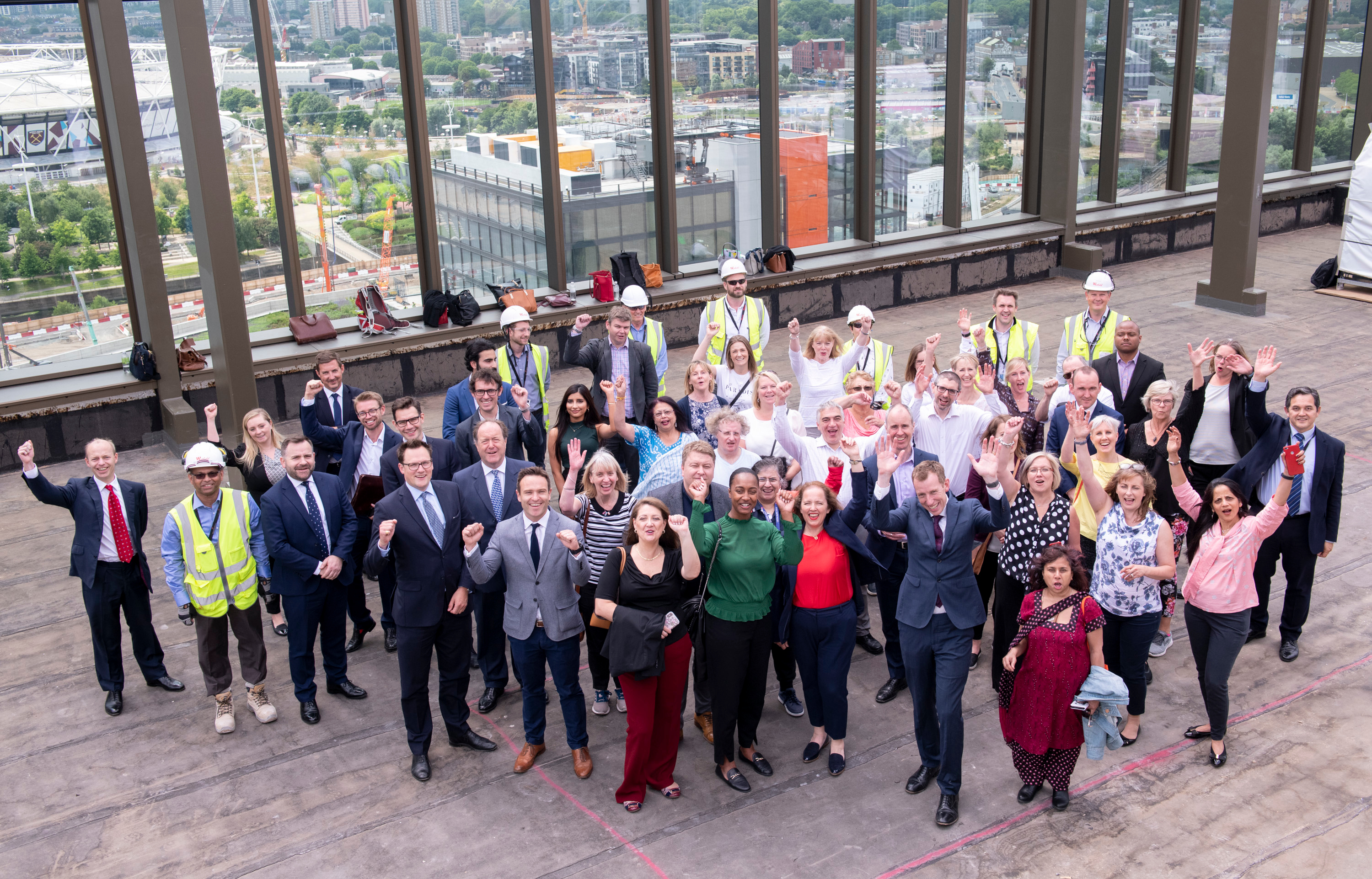 I followed a group of senior executives from Unibail-Rodamco-Westfield, Her Majesty’s Revenue and Customs (HMRC), Legal & General, contractors, and other guests through the dedicated walkway that ultimately lead us to, what will soon be the rooftop garden of the Westfield M7 building. Once on the roof, we received speeches while overlooking spectacular views of the London Skyline - the Olympic stadium front and centre. After the speeches a chrome spanner was wielded to tighten the last bolt and commemorate the topping out of the HMRC’s newest regional hub.